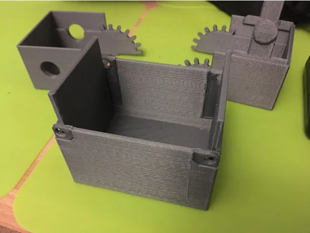 Để lắp bản gốc, in tất cả các chi tiết. Sau đó gắn pivot plates vào base (xem hình). Chúng nên nằm khá sát (flush) với vách bên, để bánh răng trên lid có thể đi qua. Vì pivot plates được in theo hướng layer chạy dọc theo trục dài nên chúng có thể hơi uốn để vào vị trí và ôm được pivot pins trên lid. Nếu vẫn không được, bạn có thể đặt cả hệ (lids, pivot plates và card cart) vào base cùng một lần.