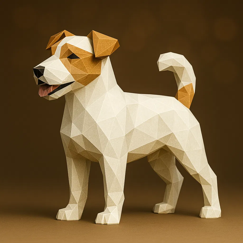Chú chó Jack Russell Terrier low-poly trong dáng đứng đầy năng lượng, tai dựng và đuôi cong. Hình khối dạng facet (đa diện) thể hiện rõ vóc dáng nhỏ gọn, lanh lẹ và thần thái vui tươi. Thiết kế nhằm tái hiện sự cảnh giác và tính cách tinh nghịch đặc trưng của giống.