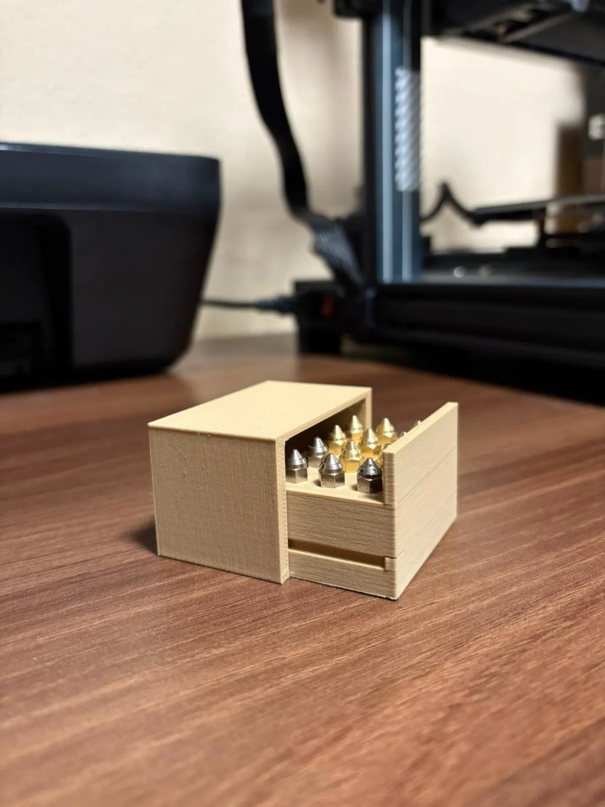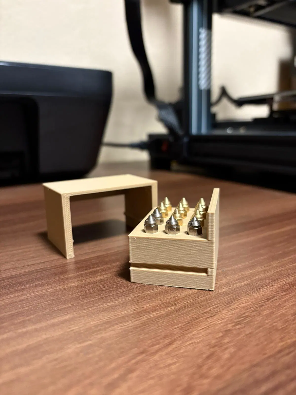 Mình thử sắp xếp lại cho gọn mấy cái nozzle đang để lung tung. Hộp này chứa được 12 nozzle, vặn vào là xài. Mấy lỗ không có ren sẵn, nhưng dung sai cho phép vặn nozzle vào mà không cần tạo ren. Thiết kế vậy để nozzle không bị văng ra khỏi lỗ.