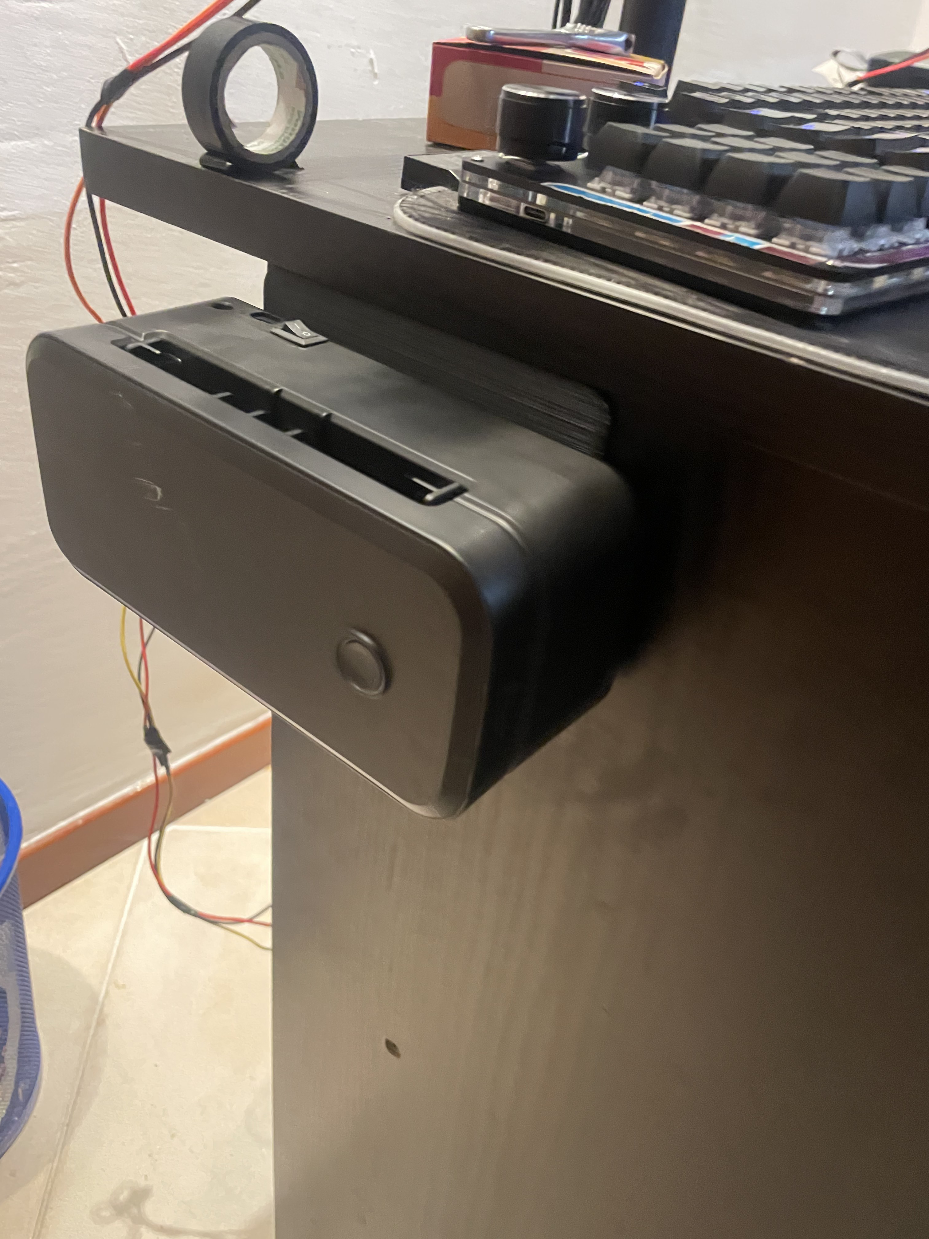 Bộ gá treo hông bàn cho máy in nhiệt in tem vận chuyển, dựng đứng máy để giải phóng mặt bàn. Không cần khoan hay dùng vít: chỉ dán bằng Hot Glue hoặc Nano Tape/Heavy Duty mounting tape, canh được mọi độ dày máy.