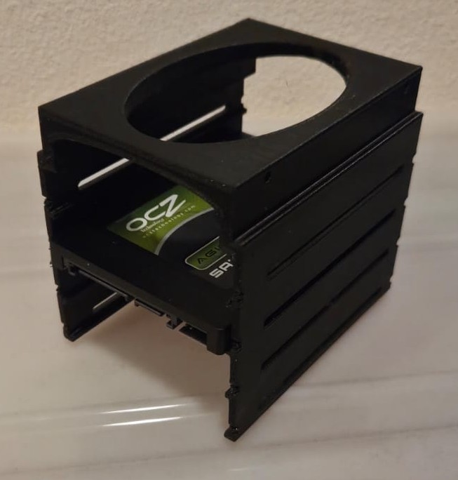 Bracket/gá đỡ gắn cùng lúc 4 ổ SSD 2,5 inch (có thể dùng cho HDD). Phù hợp các case có vị trí gắn SSD dưới khay 3.5/5.25 inch; in PETG, dùng organic support cho overhang.