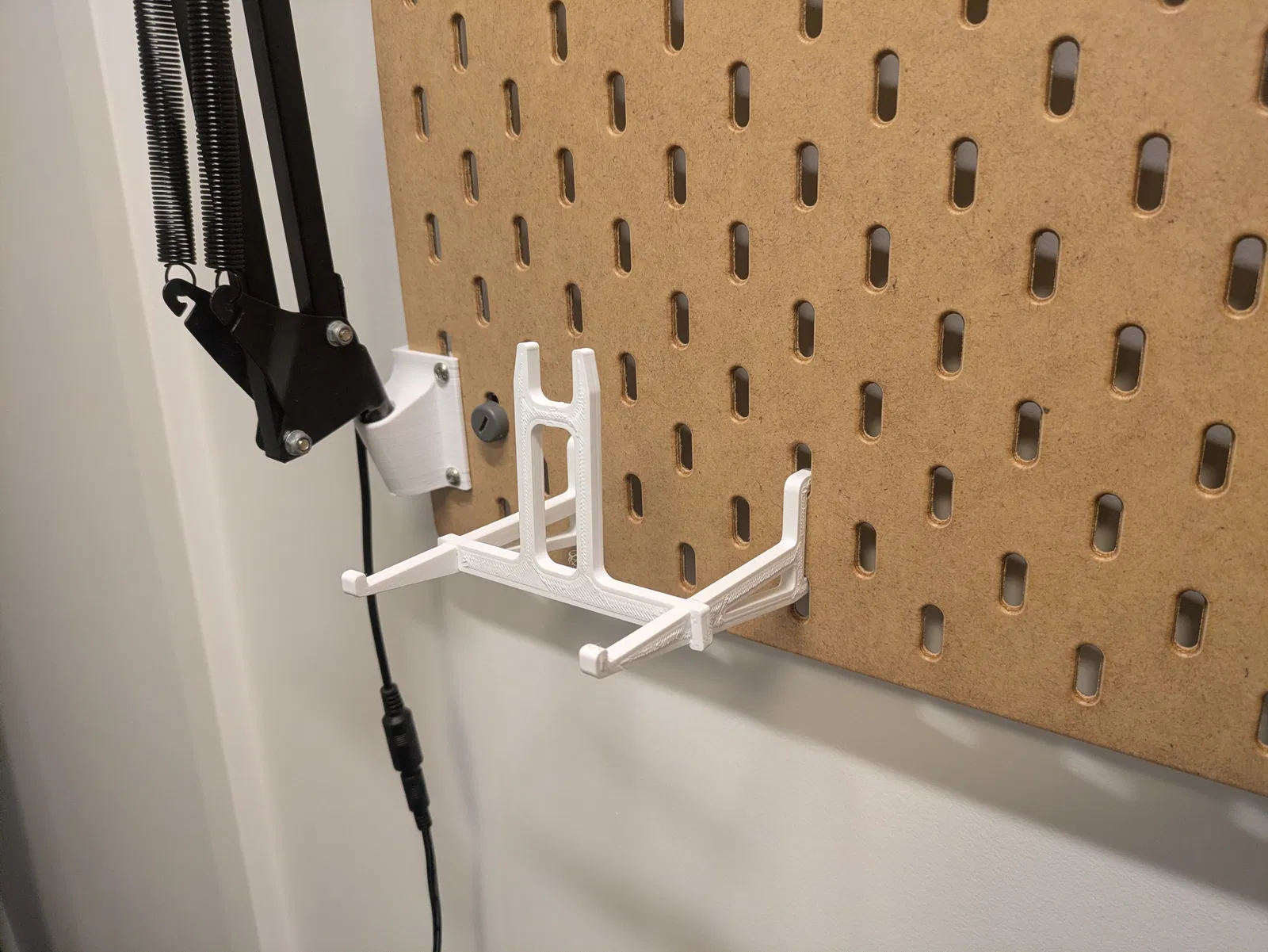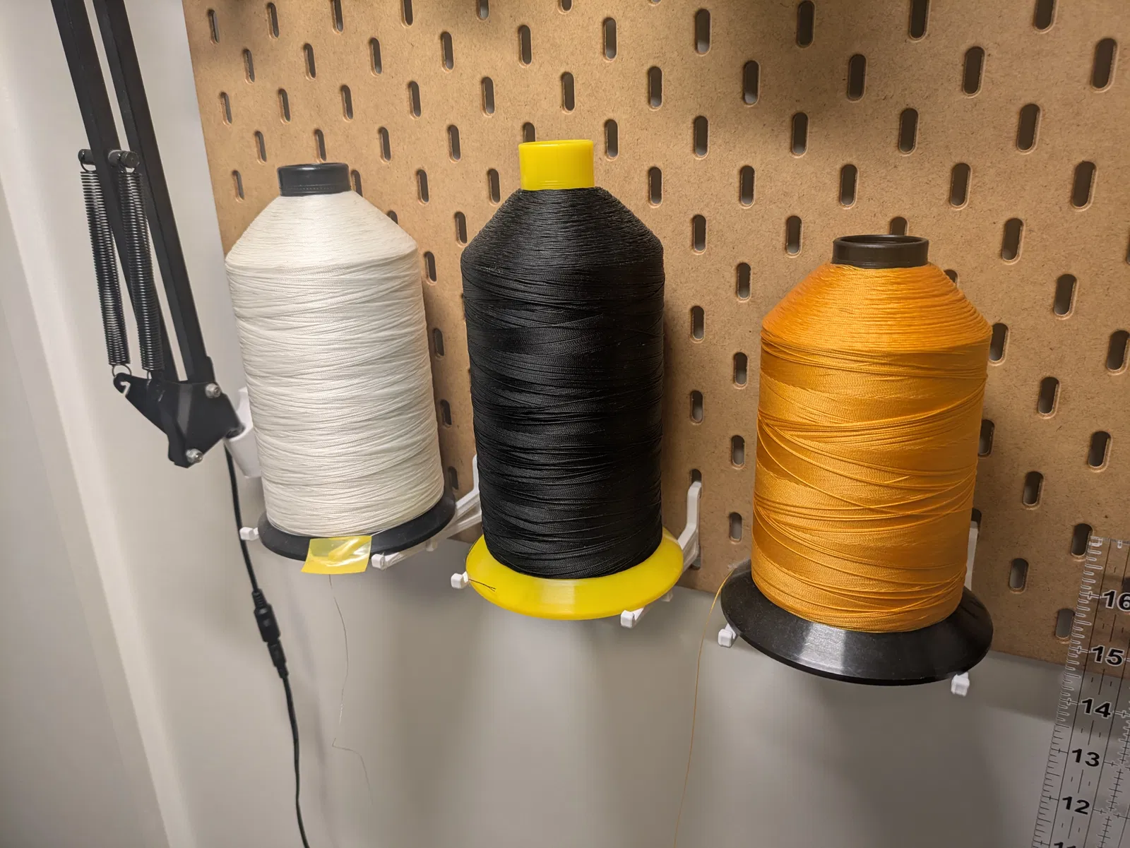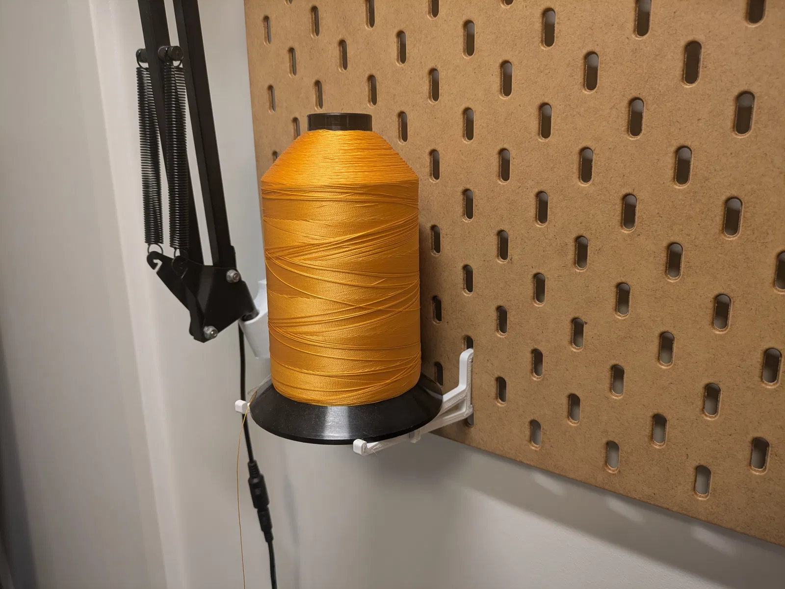 Một cái giá đỡ chắc chắn và tiết kiệm filament để treo cuộn chỉ cỡ lớn lên pegboard Ikea Skadis. Cuộn chỉ mình dùng đường kính 100mm (3.94in) và đường kính trong khoảng 25mm (0.9in).