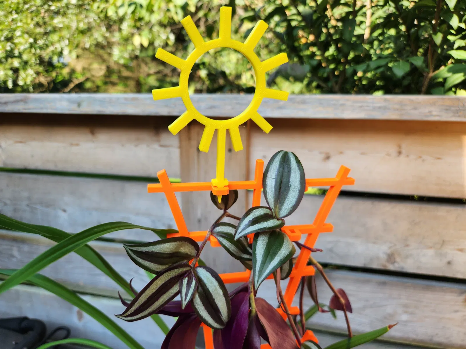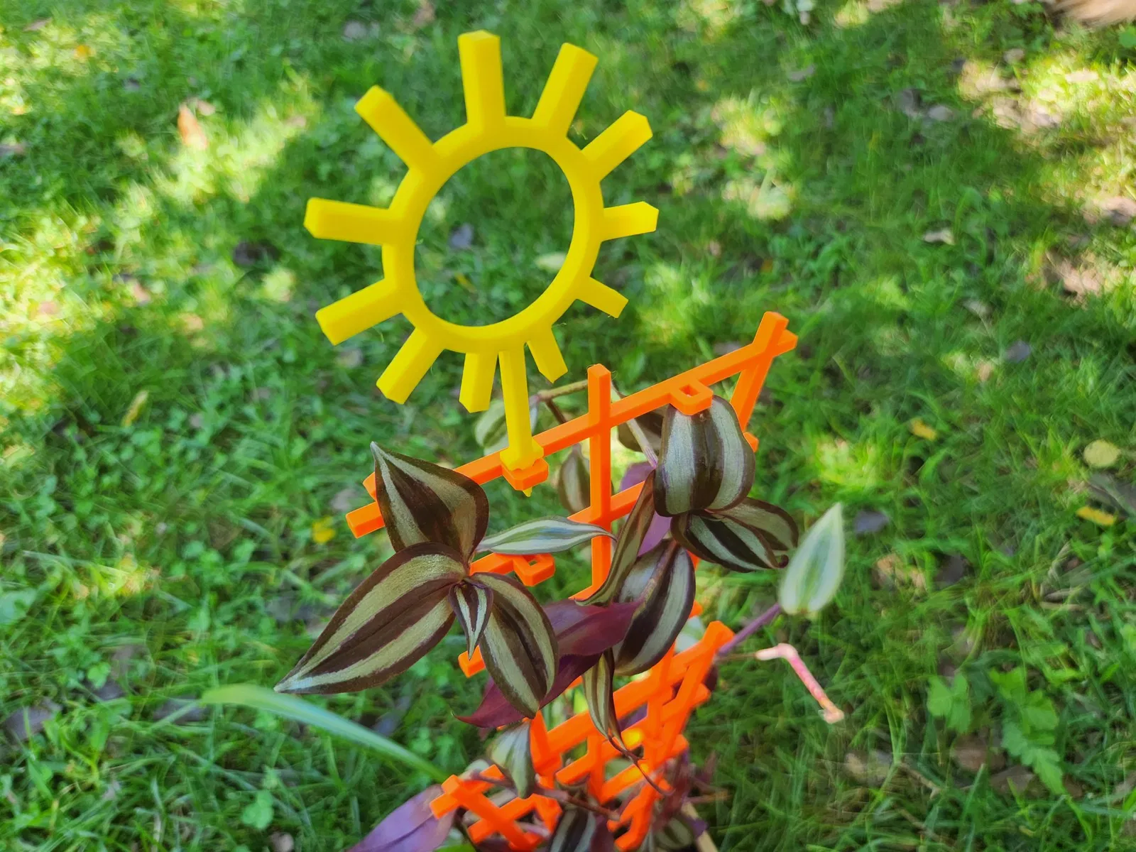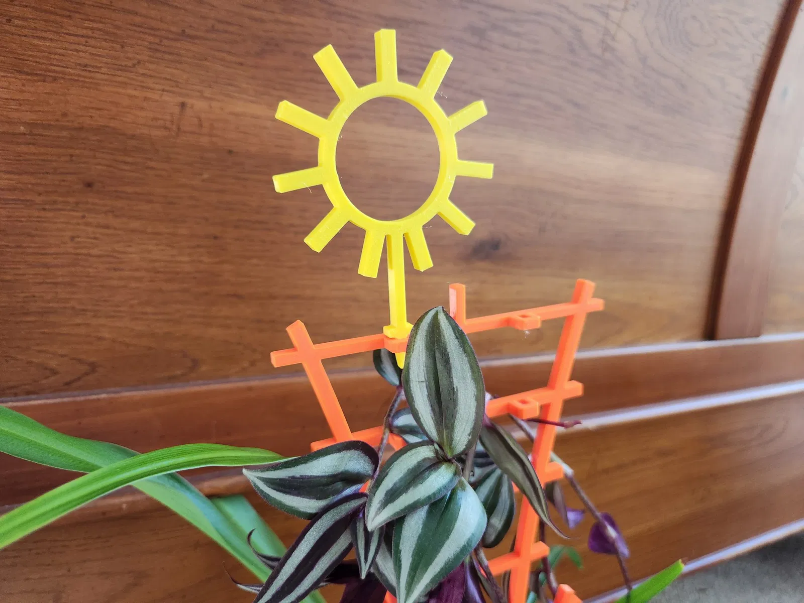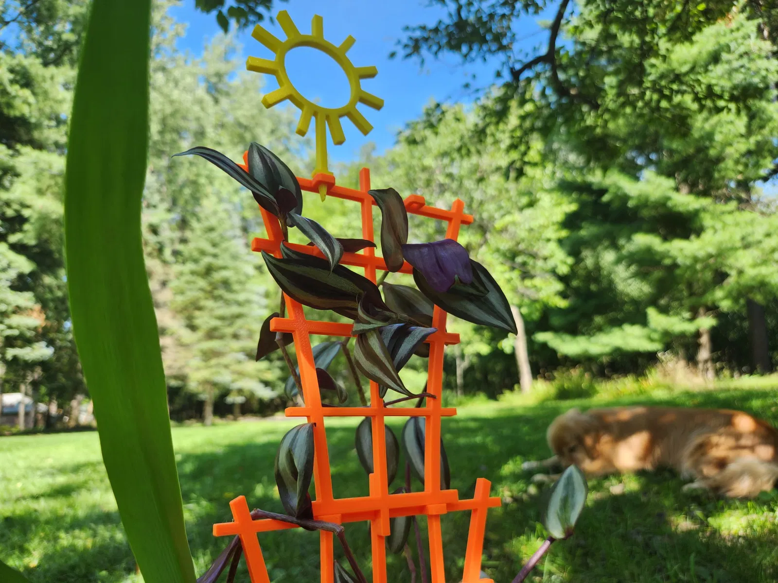 Được tạo ra cho cuộc thi của nhà máy leo núi & hỗ trợ của nhà máy trên một thiết kế Trellis đơn giản có sẵn tại nhiều cửa hàng vườn. Các bộ phận được thiết kế để xếp chồng lên nhau để hỗ trợ các nhà máy leo ở các độ cao khác nhau, và sau đó vật trang trí mặt trời có thể được trượt tùy ý lên trên cùng.