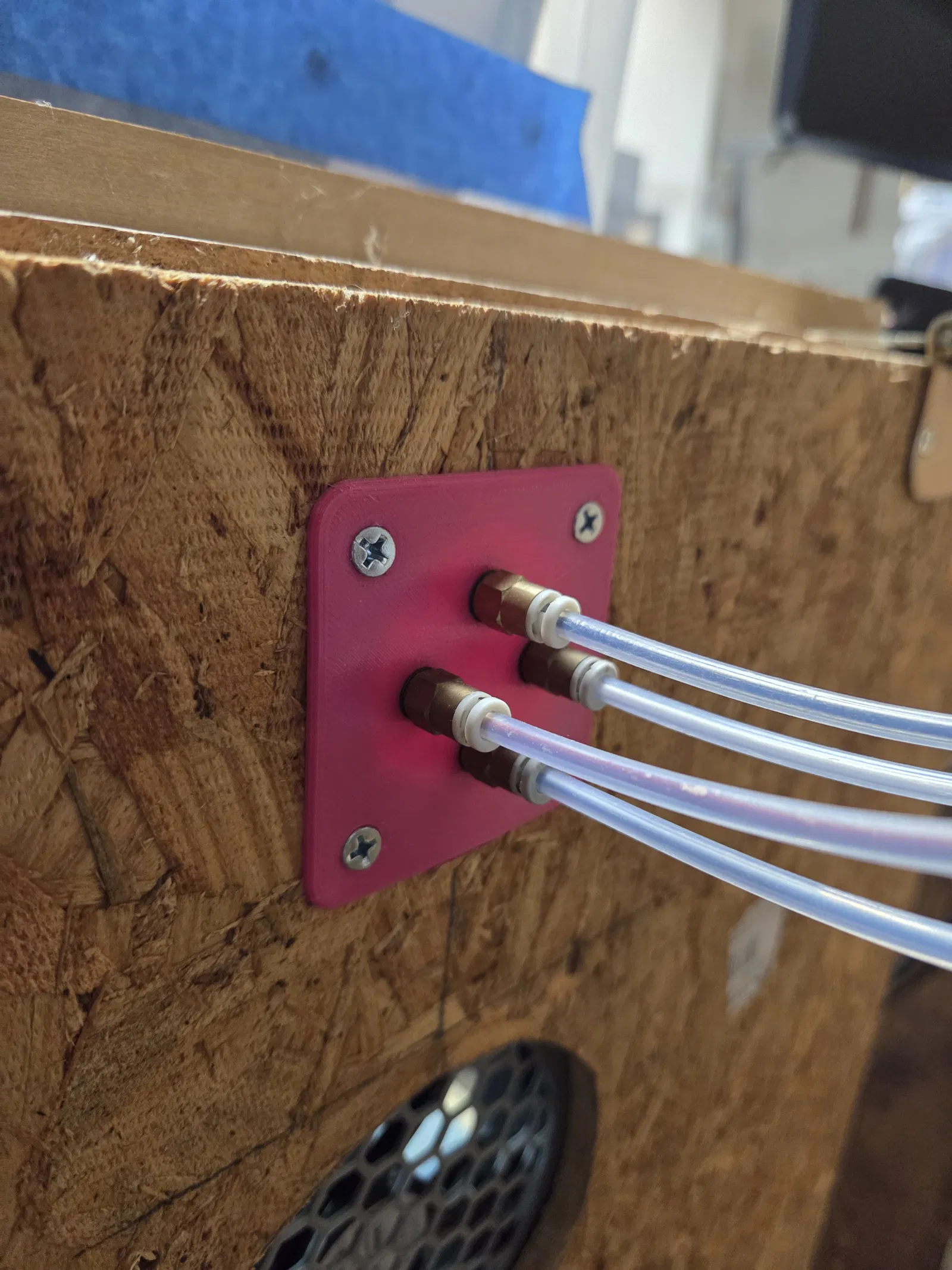 Bulkhead filament đơn giản cho 4 đầu nối thẳng 6mm, phù hợp đi dây/đưa filament qua vách. Bắt cố định bằng vít #6 hoặc #8 countersunk. Thiết kế để dùng chung với thùng sấy AMS “ghetto”.