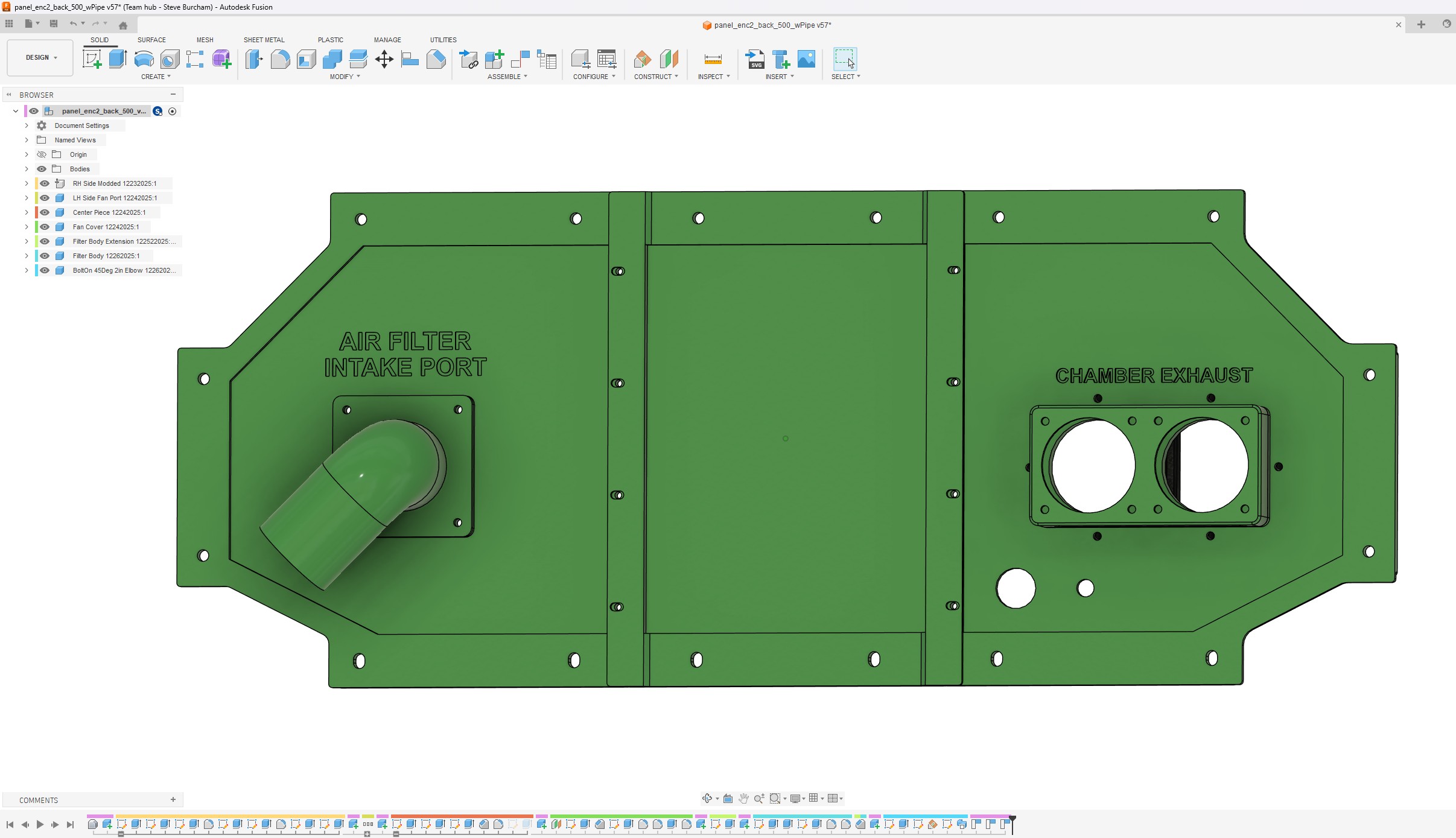 Đây là Rat Rig VCore 3.1 Upper Rear Panel được in 3D, có cổng gắn lọc khí 2 inch, ngàm gắn cảm biến nhiệt độ buồng (chamber temp sensor), và đường xả buồng có lọc (filtered chamber exhaust).