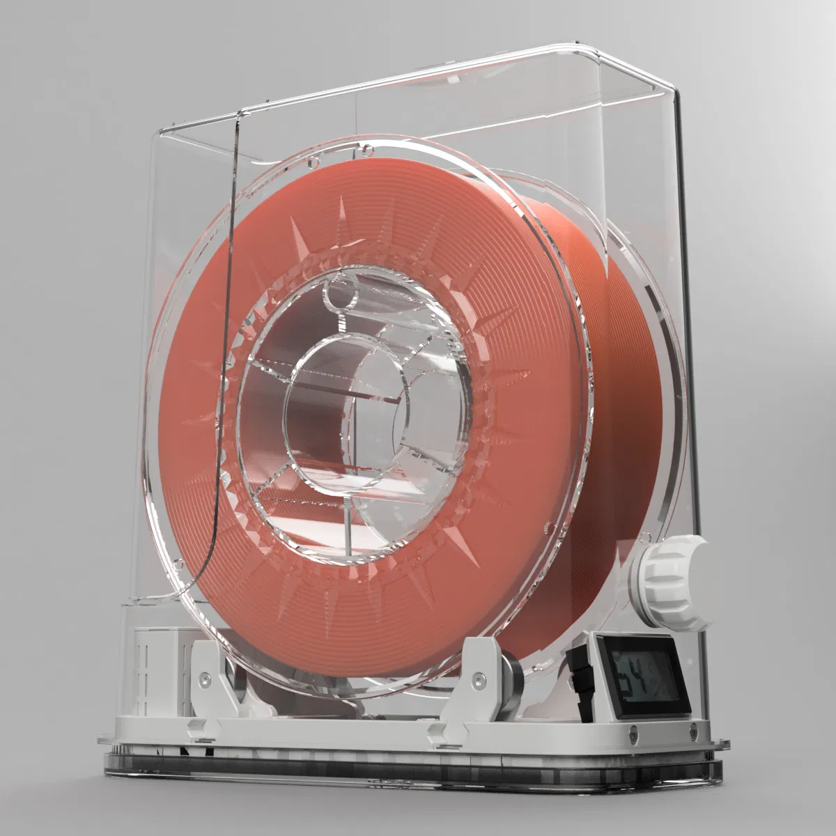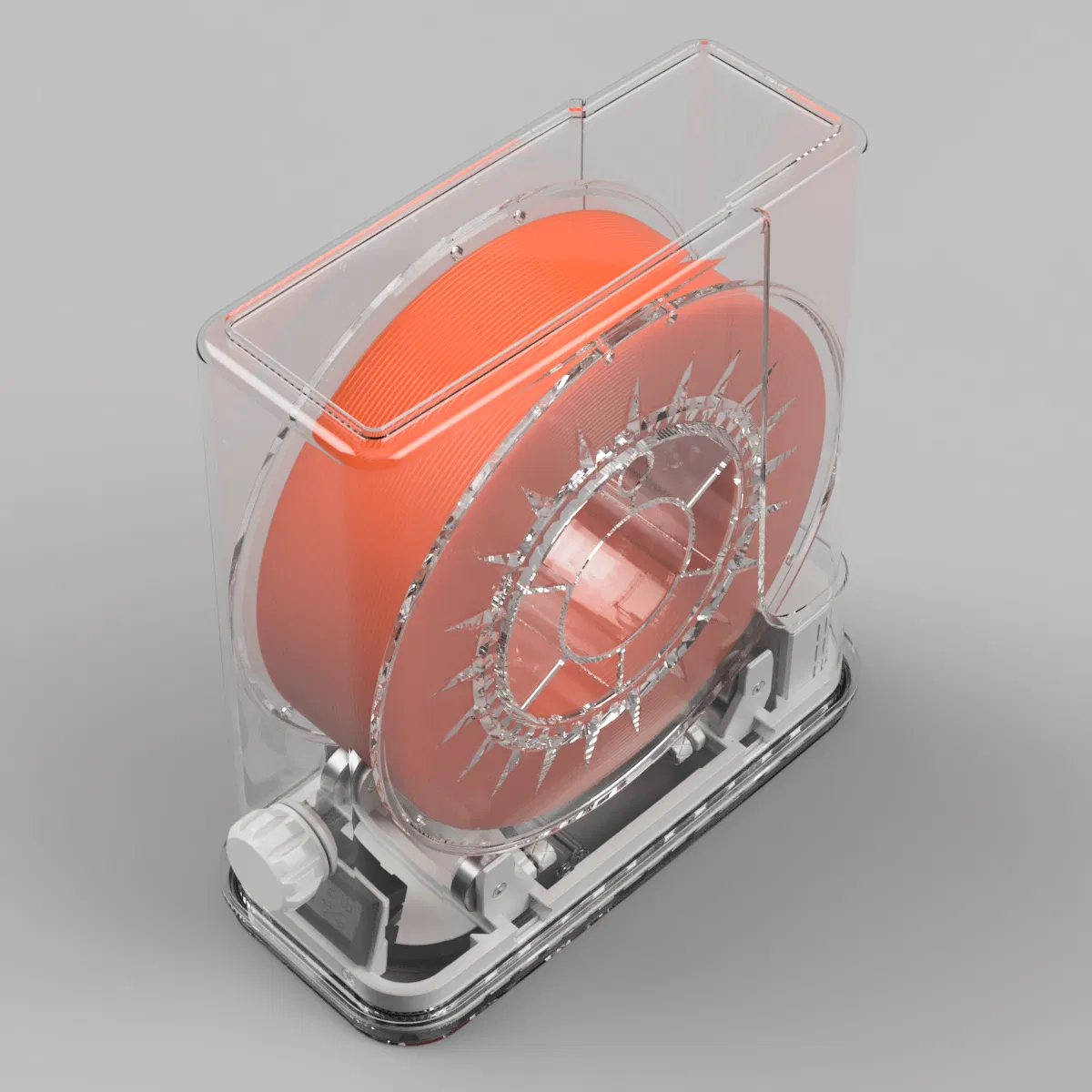 Hiện nay có rất nhiều thiết kế dùng hộp đựng ngũ cốc (cereal container) loại bếp tiêu chuẩn để giữ từng cuộn filament an toàn và khô ráo khi lưu kho và cả lúc đang in. Nhưng do có quá nhiều mẫu hộp bếp khác nhau, nên việc kiếm đúng loại hộp cần thiết khá khó, nhất là khi hộp đến từ nhà bán theo khu vực. Vì vậy, thiết kế này dựa trên một mẫu hộp phổ biến và dễ mua hơn từ Aliexpress.