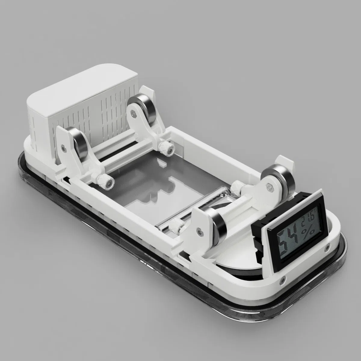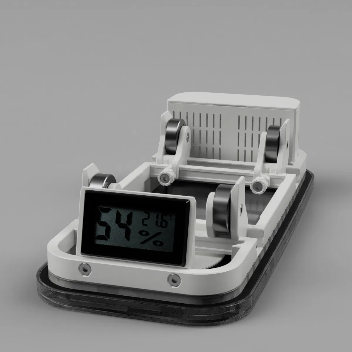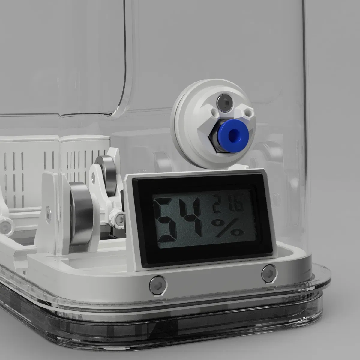 Một hygrometer đơn giản, rẻ tiền được gắn lên base frame thông qua một ngàm/giá đỡ riêng, để có thể nhìn chỉ số hygrometer ngay từ bên ngoài hộp.