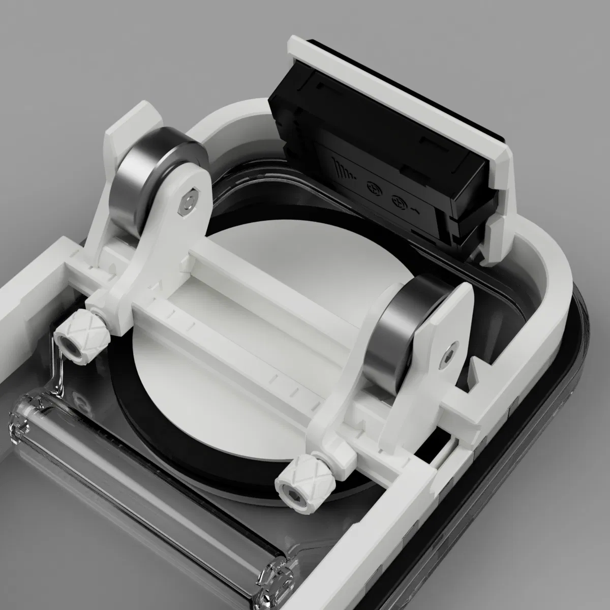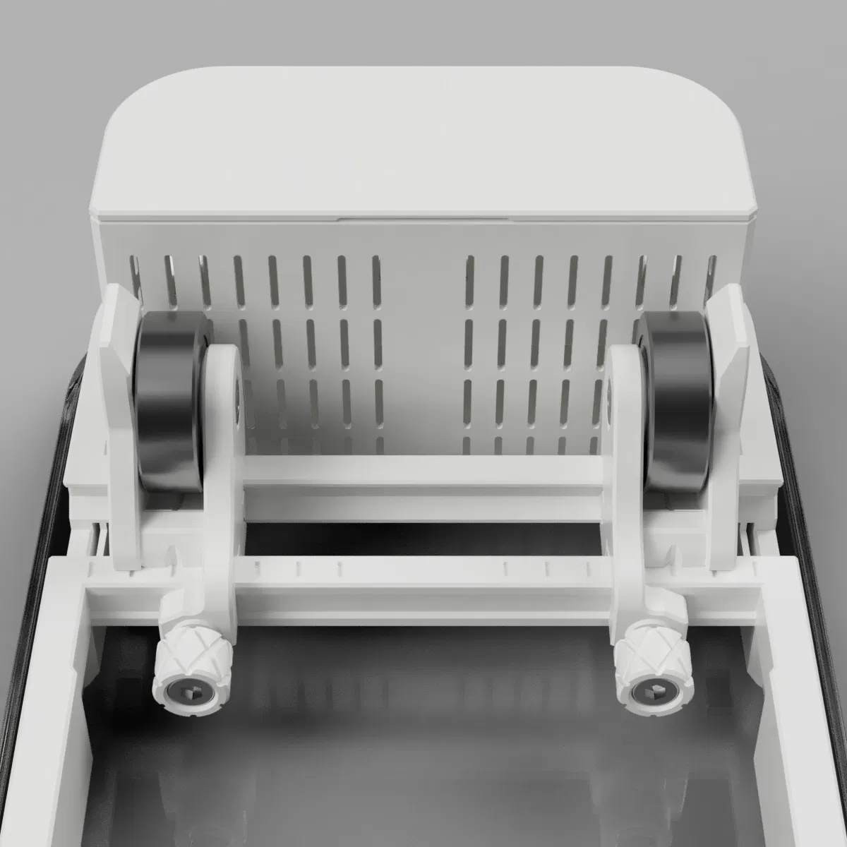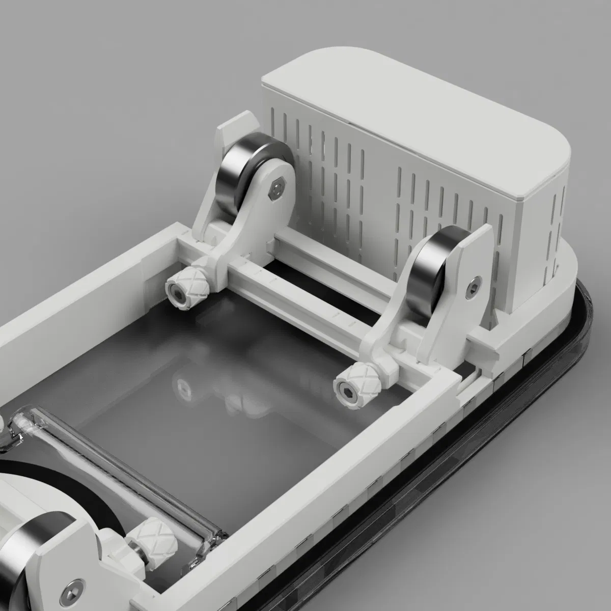 Thiết kế dựa trên hộp ngũ cốc này dùng 4 vòng bi để đỡ cuộn spool bên trong hộp. Các vòng bi được gắn trên các slider có thể trượt tự do trên các rãnh (track) được thiết kế riêng để phù hợp với nhiều bề ngang spool khác nhau (hỗ trợ spool rộng 20–70mm). Slider được cố định vị trí bằng các thumbscrew đặc biệt. Phần track nằm trên một khung đế (base frame) đặt vừa trong nắp hộp.