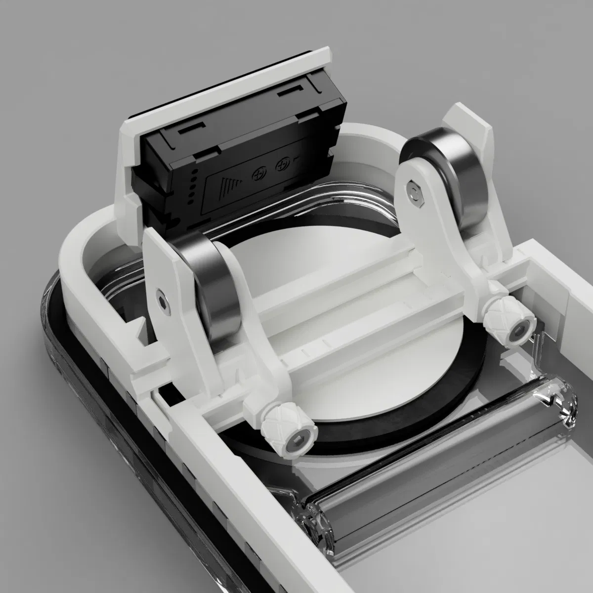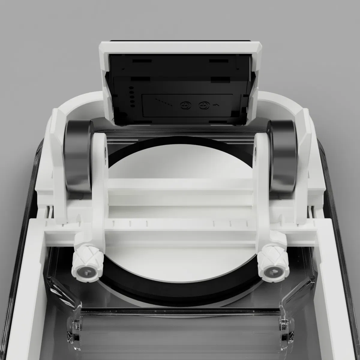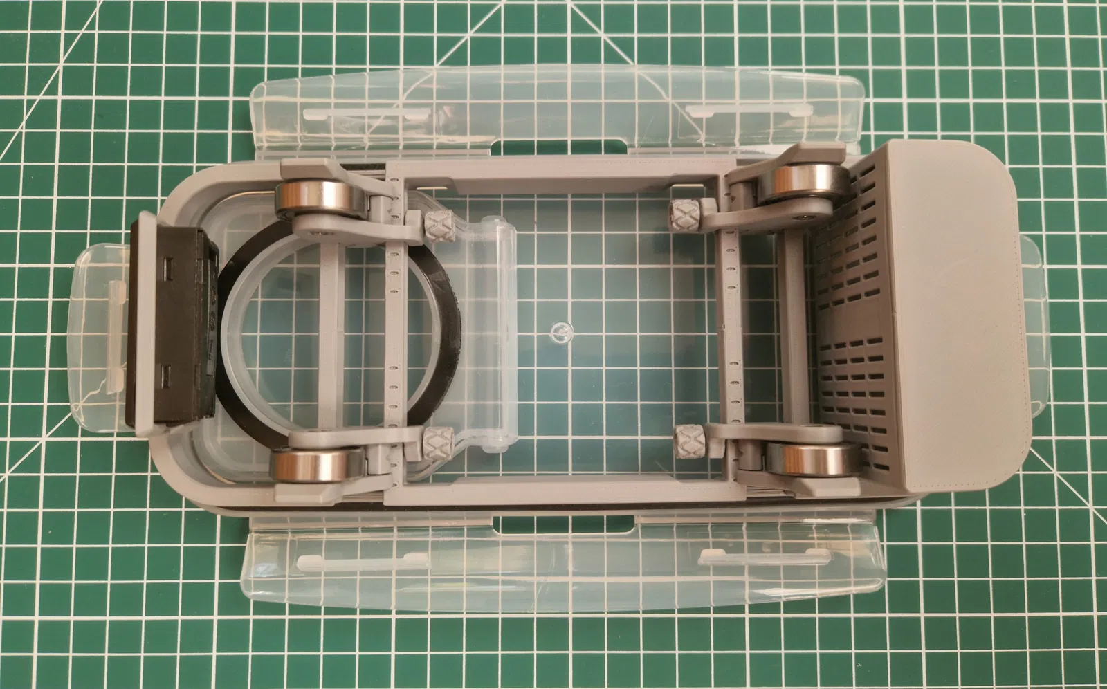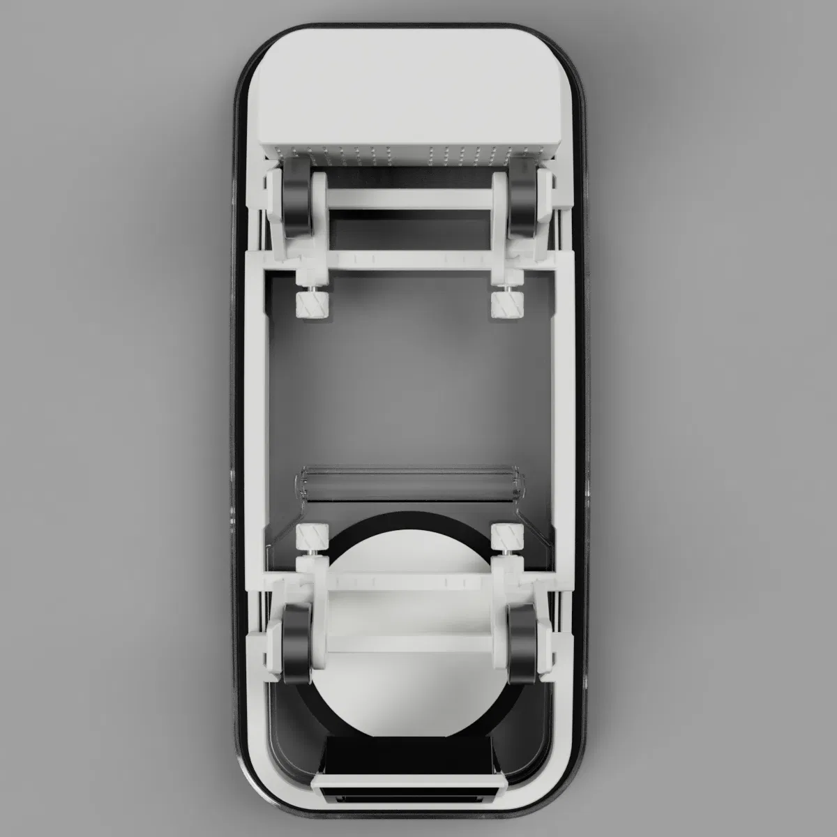 Thiết kế dựa trên hộp ngũ cốc này dùng 4 vòng bi để đỡ cuộn spool bên trong hộp. Các vòng bi được gắn trên các slider có thể trượt tự do trên các rãnh (track) được thiết kế riêng để phù hợp với nhiều bề ngang spool khác nhau (hỗ trợ spool rộng 20–70mm). Slider được cố định vị trí bằng các thumbscrew đặc biệt. Phần track nằm trên một khung đế (base frame) đặt vừa trong nắp hộp.