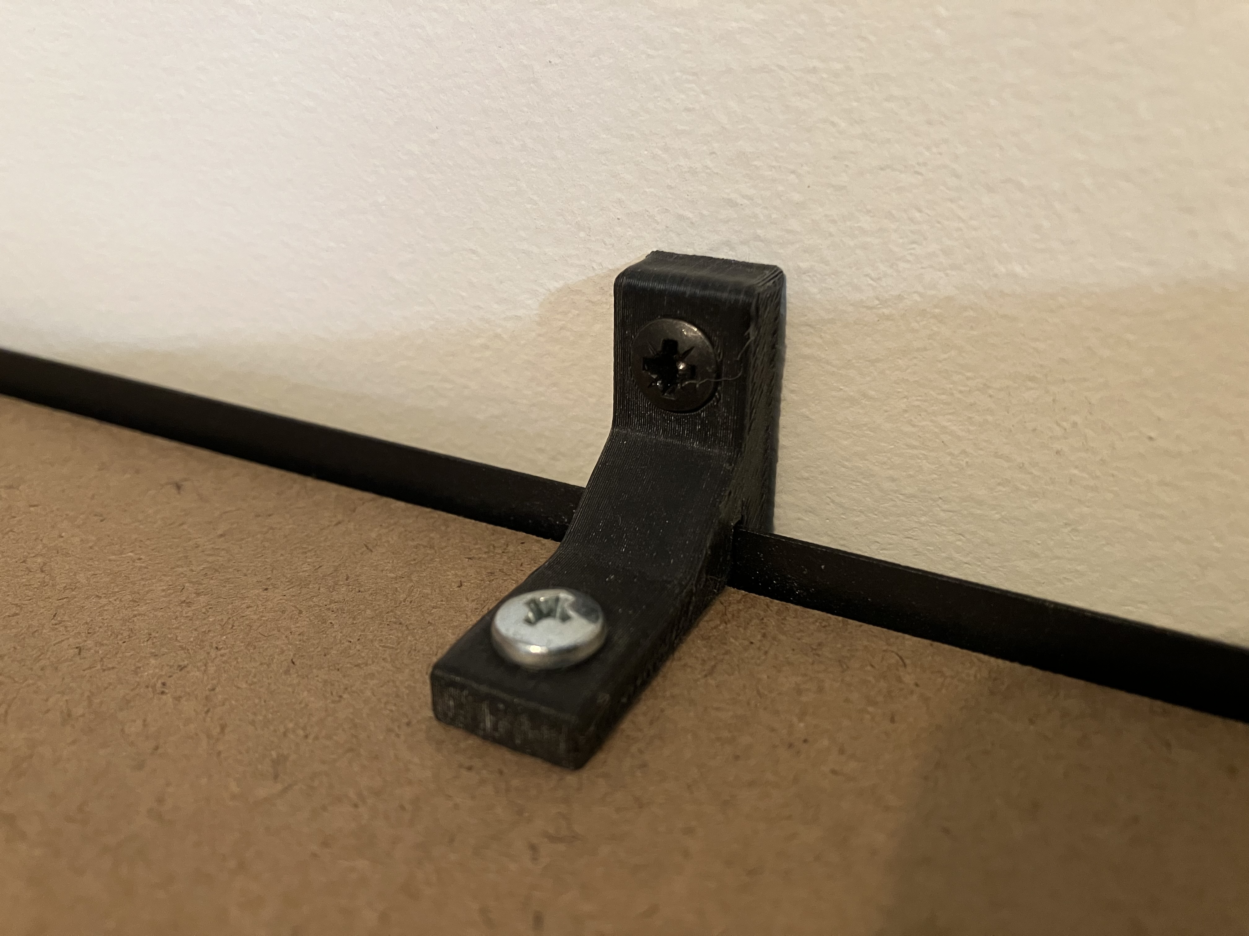 Dùng stud finder để tìm đúng thanh stud. Ép bracket xuống mép kệ, với lỗ countersunk quay về phía tường (xem hình). Dùng vít dài 1.5 inch hoặc dài hơn để bắt bracket vào stud (con vít màu đen trong hình). Tùy chọn nhưng khuyến nghị: có thể thêm một vít gỗ panhead để giữ phía còn lại vào đáy kệ.