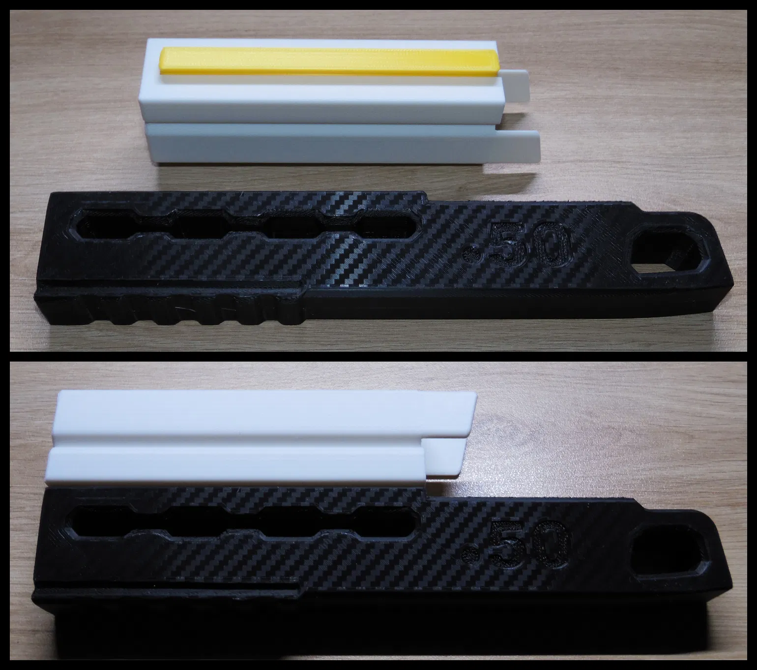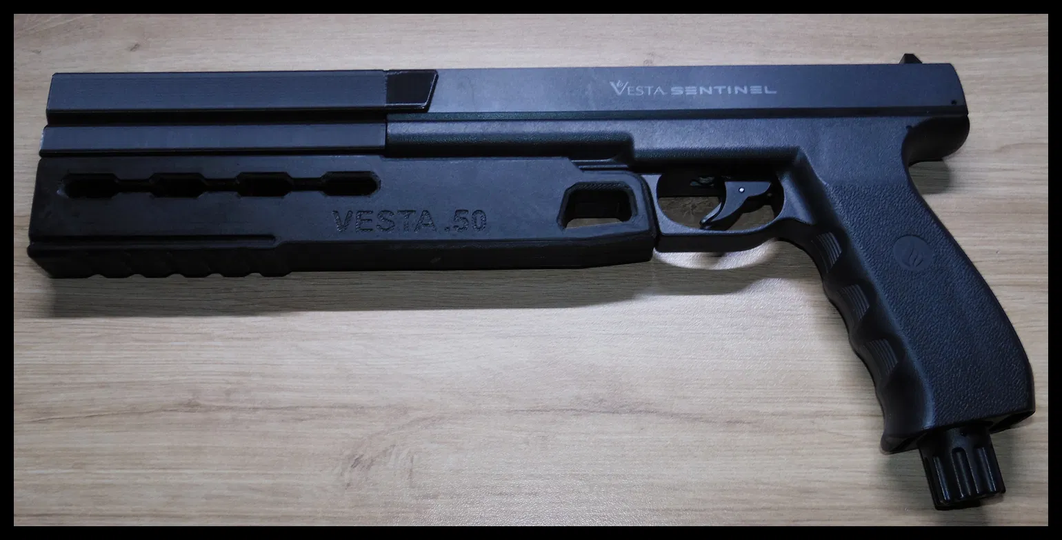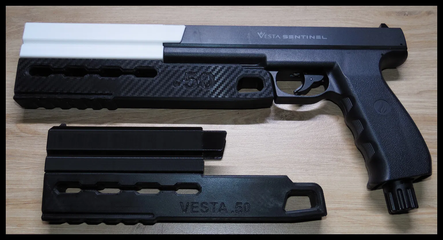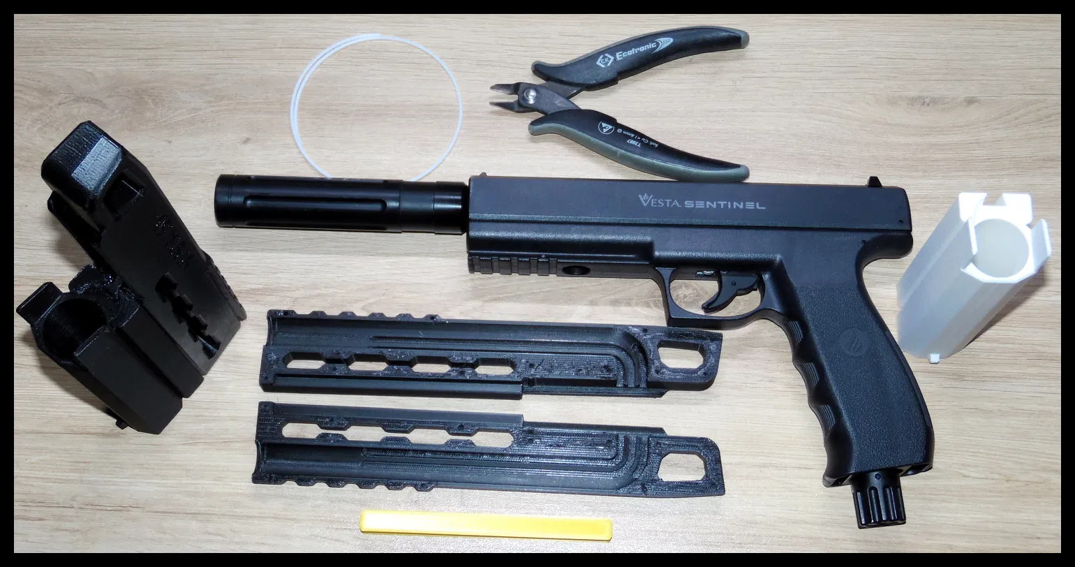 Bản nâng cấp băng đạn dài và đổi ngoại hình cho Vesta Sentinel: in 3 chi tiết, dán lại thành một cụm gắn lên trên để thay băng đạn zin. Chứa thêm 15 BBs (ngoài 6 BBs của Vesta). Dùng PLA/PETG và O-ring 16×2 mm.