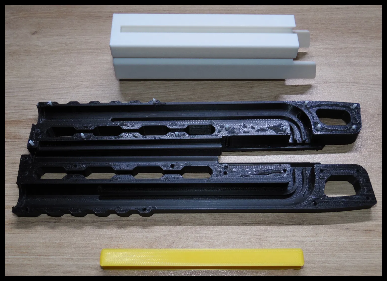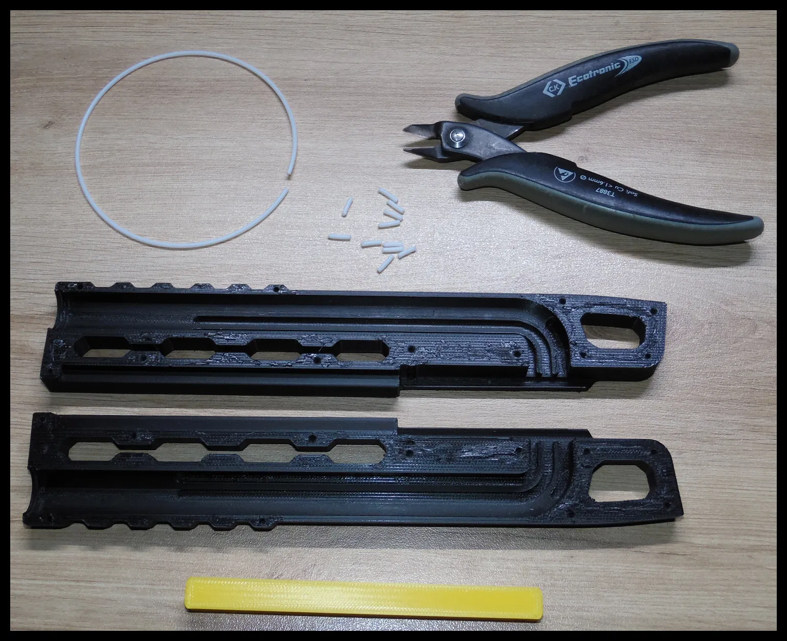 Dán hai phần của băng đạn lại với nhau bằng cách cắt những mẩu PLA nhỏ và dán các phần còn lại để tạo thành cụm này, thay thế cho băng đạn zin.