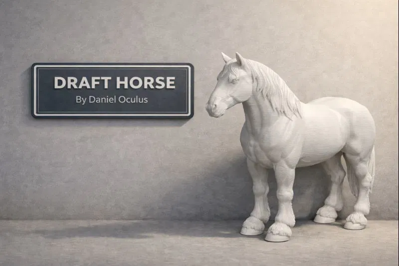 Mẫu ngựa kéo hạng nặng, cơ bắp cuồn cuộn với bề mặt có vân layer-line nhẹ, nhìn như vừa 3D print xong và nhấc thẳng khỏi plate. Tỷ lệ gọn gàng, dáng đứng chắc khỏe, chi tiết bề mặt rõ nét—hợp cho ai mê kiểu in thiên về điêu khắc hoặc cần một món trưng bày “đậm chất horsepower”. Có thể dùng làm wall art, decor bàn làm việc, trang trí kệ, v.v.