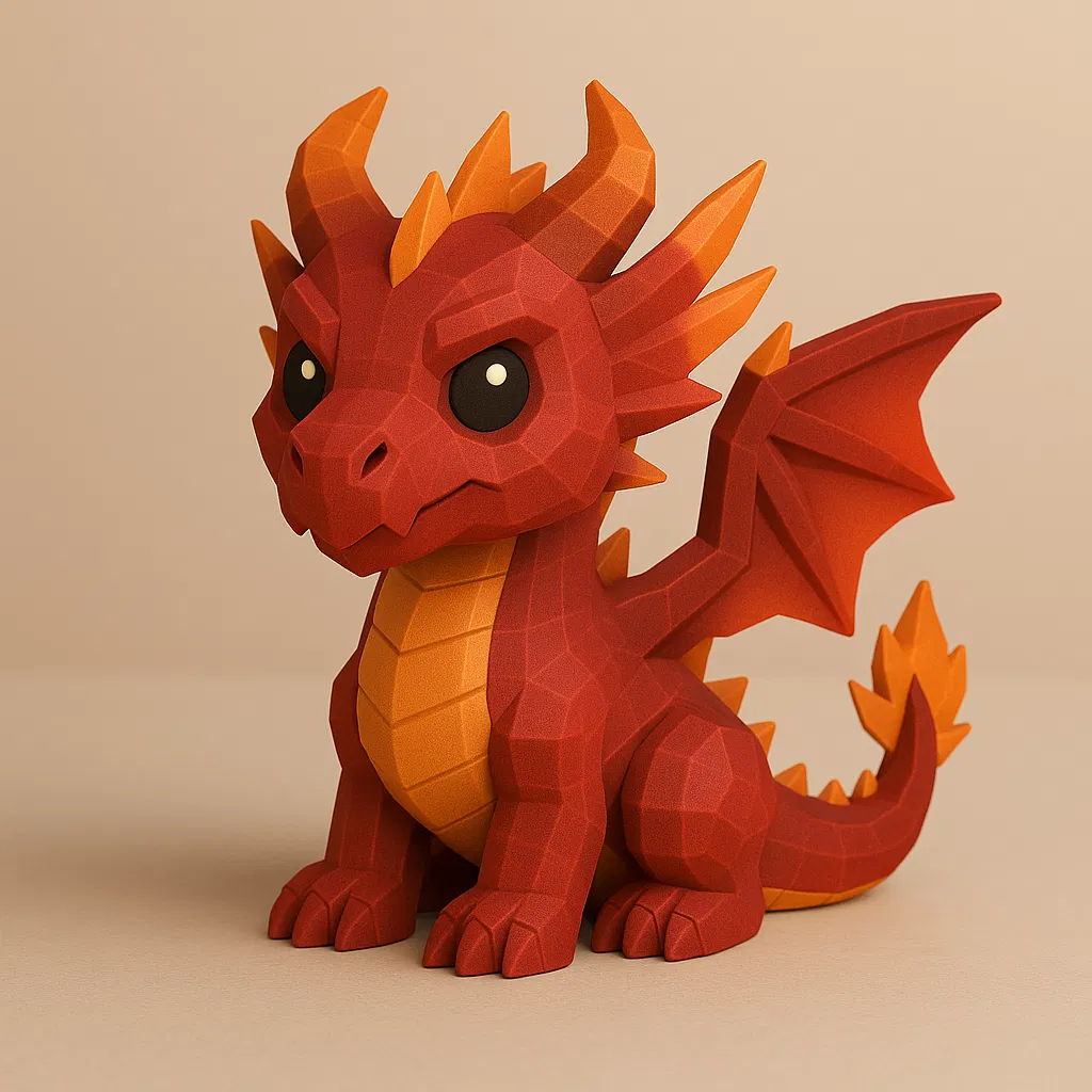 Một chú rồng low-poly đầy dữ dằn, được tạo hình bằng các mảng khối góc cạnh cùng tông đỏ–cam rực lửa. Lớp vảy xếp tầng, cặp sừng và ánh nhìn bùng cháy mang lại cảm giác như một hộ vệ dung nham sinh ra từ lòng núi lửa.