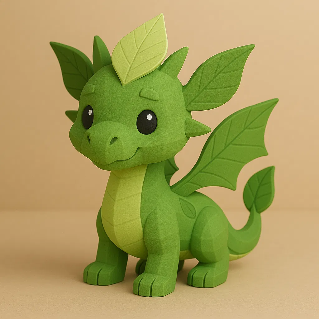 Một chú rồng low-poly tươi mới, đầy sức sống với hình khối lấy cảm hứng từ lá cây. Đôi cánh nhiều lớp, phần mào như tán lá và các tông xanh tự nhiên tượng trưng cho sự phát triển, tái sinh và tinh thần dịu dàng của thiên nhiên.