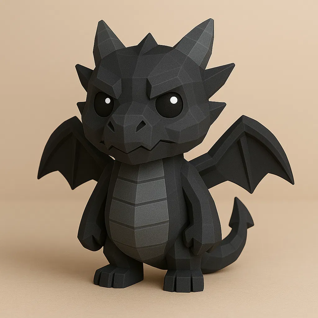 Một chú rồng mini phong cách low-poly gọn gàng, được thể hiện bằng tông đen mờ sâu với các mảng góc cạnh nhưng tỷ lệ vẫn cân đối. Dáng đứng toát ra sức mạnh trầm lặng, mang theo sự tĩnh lặng bí ẩn của màn đêm.
