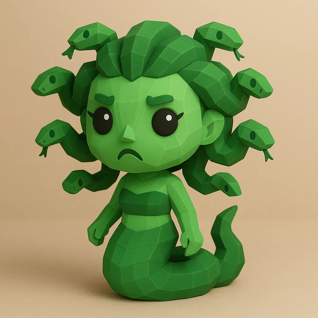 Mini Medusa khắc họa nét duyên dáng xen lẫn bi kịch bằng hình khối cân đối, đường nét uốn lượn. Cần supports cho rắn/cằm/tay; khuyến nghị layer height 0.12–0.16 mm với PLA, filament xanh dual-tone cho tương phản nổi bật.