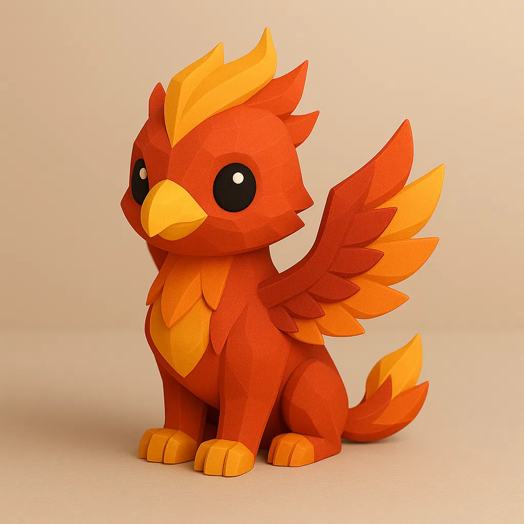 Mini Phoenix toát ra nguồn năng lượng qua đôi cánh nhiều lớp và những đường cong rực lửa. Dáng bay mềm mại của nó gợi lên sự tái sinh và sức mạnh trong một hình khối faceted sống động.
