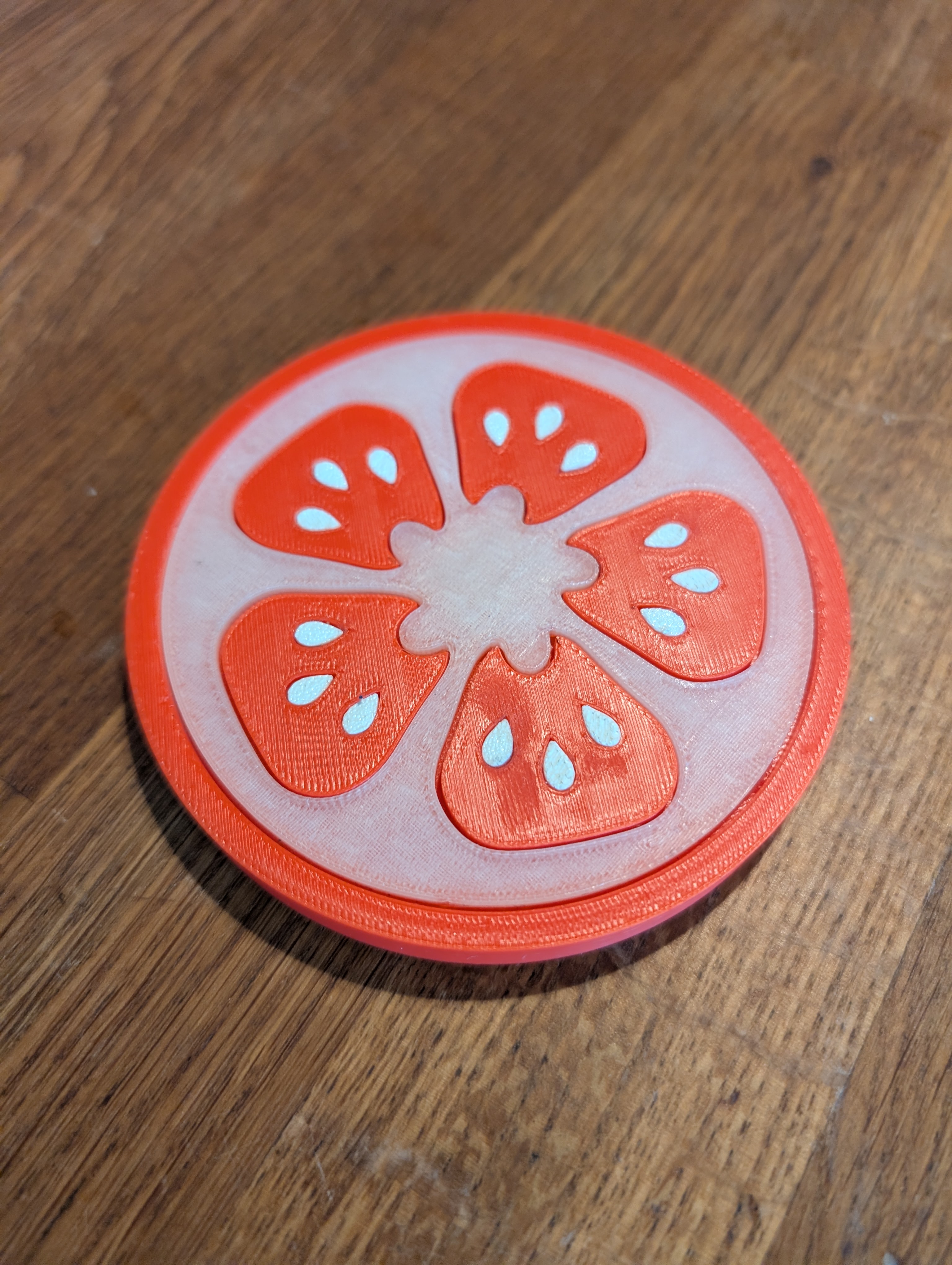 Đế lót ly hình cà chua có đồ khui nắp chai ẩn bên dưới. In thành 3 phần rời nên không cần máy multi-material/MMU. Tương thích PLA hoặc PETG, không cần supports; dùng insert đồ khui kiểu coaster.