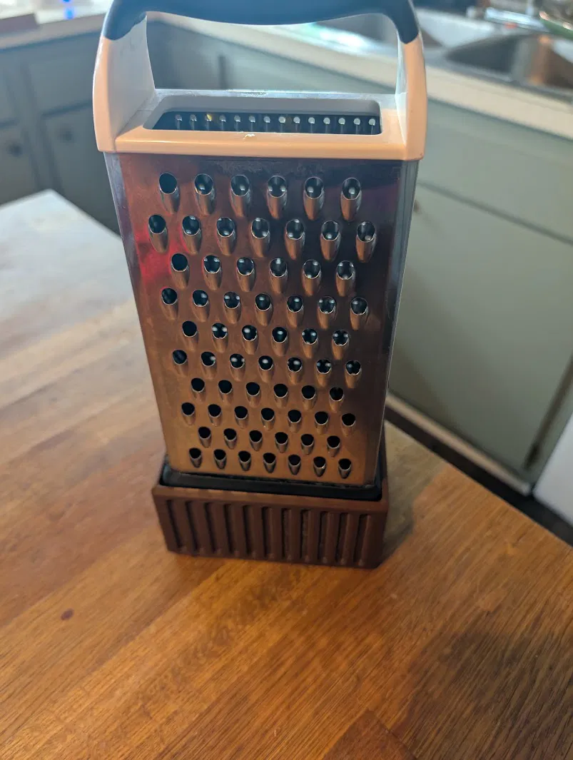Ban đầu mình rất thích mẫu All-in-One Grater Base Bowl của Chopper Originals, nhưng kích thước lại không khớp với cái đồ bào của mình. Thay vì cố dùng cho vừa, mình đã thiết kế lại toàn bộ từ đầu để fit đúng đồ bào OXO, đồng thời giữ phong cách tổng thể tương tự.