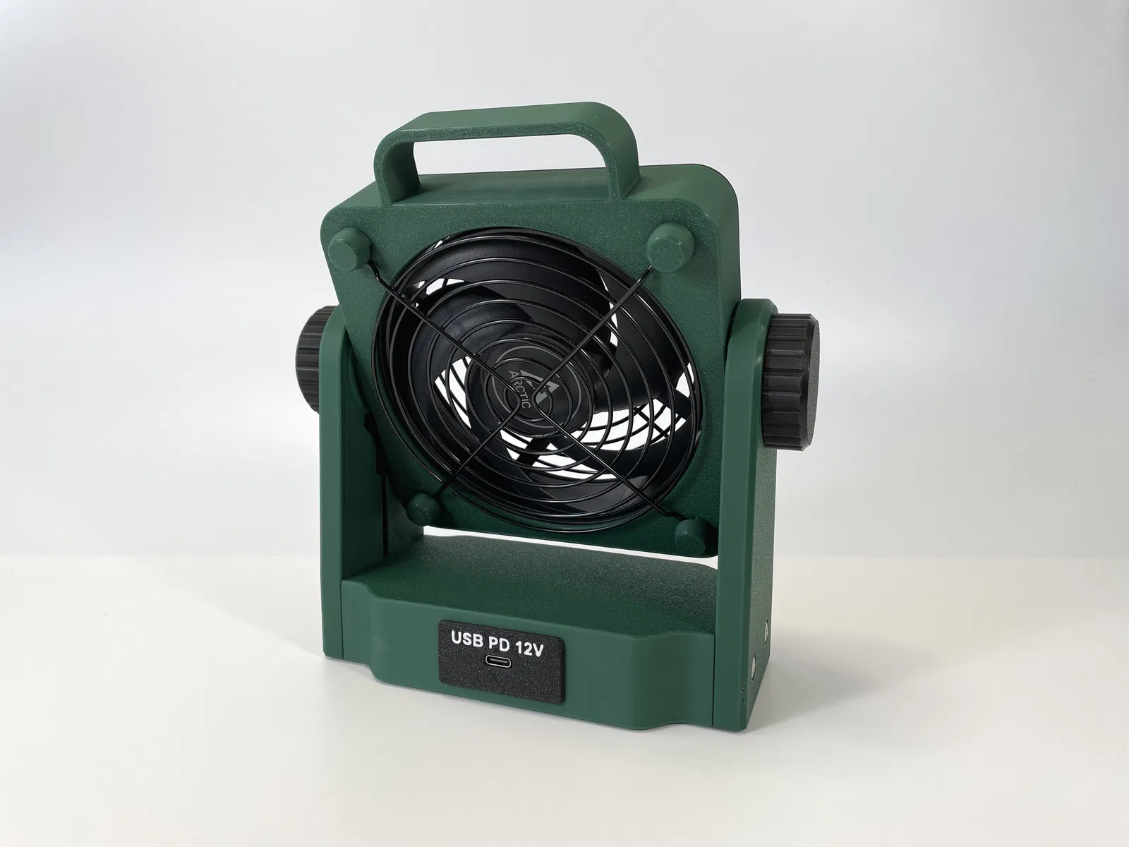 Mẫu quạt để bàn in 3D dùng computer fan 120mm, thiết kế modular dễ tuỳ biến luồng gió. Hỗ trợ công tắc on/off hoặc điều khiển PWM, chạy bằng adapter 12V hay USB-C Power Delivery, và có tuỳ chọn gắn pin Parkside X20V.