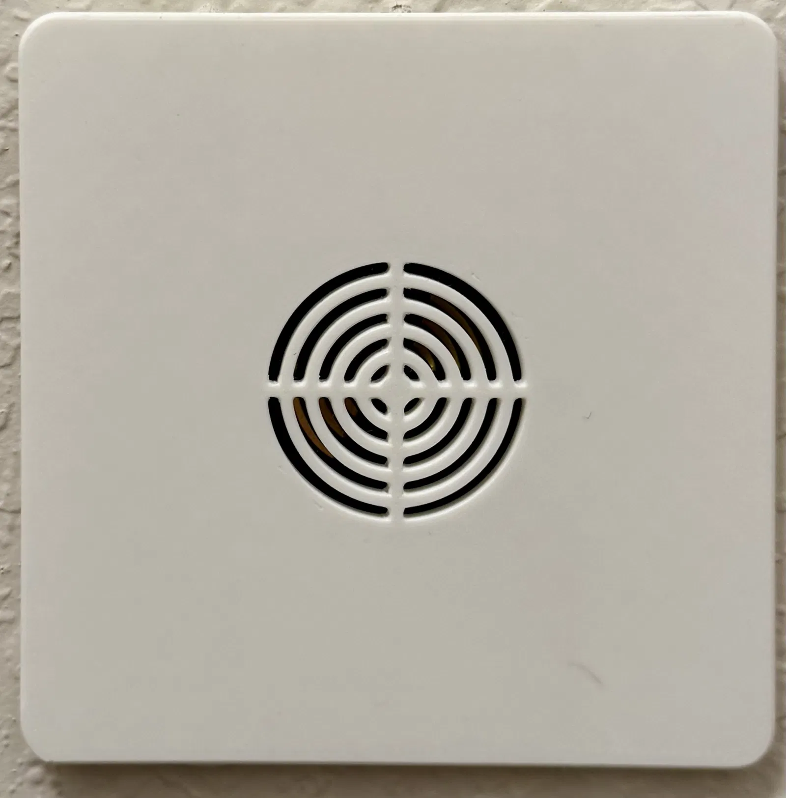 Mẫu mặt ốp tường dùng để gắn piezo buzzer điện tử cho hệ thống báo động/báo khách vào nhà. Phía sau có 2 hốc (inset) để dán command strips, giúp lắp đặt nhanh gọn lên tường.