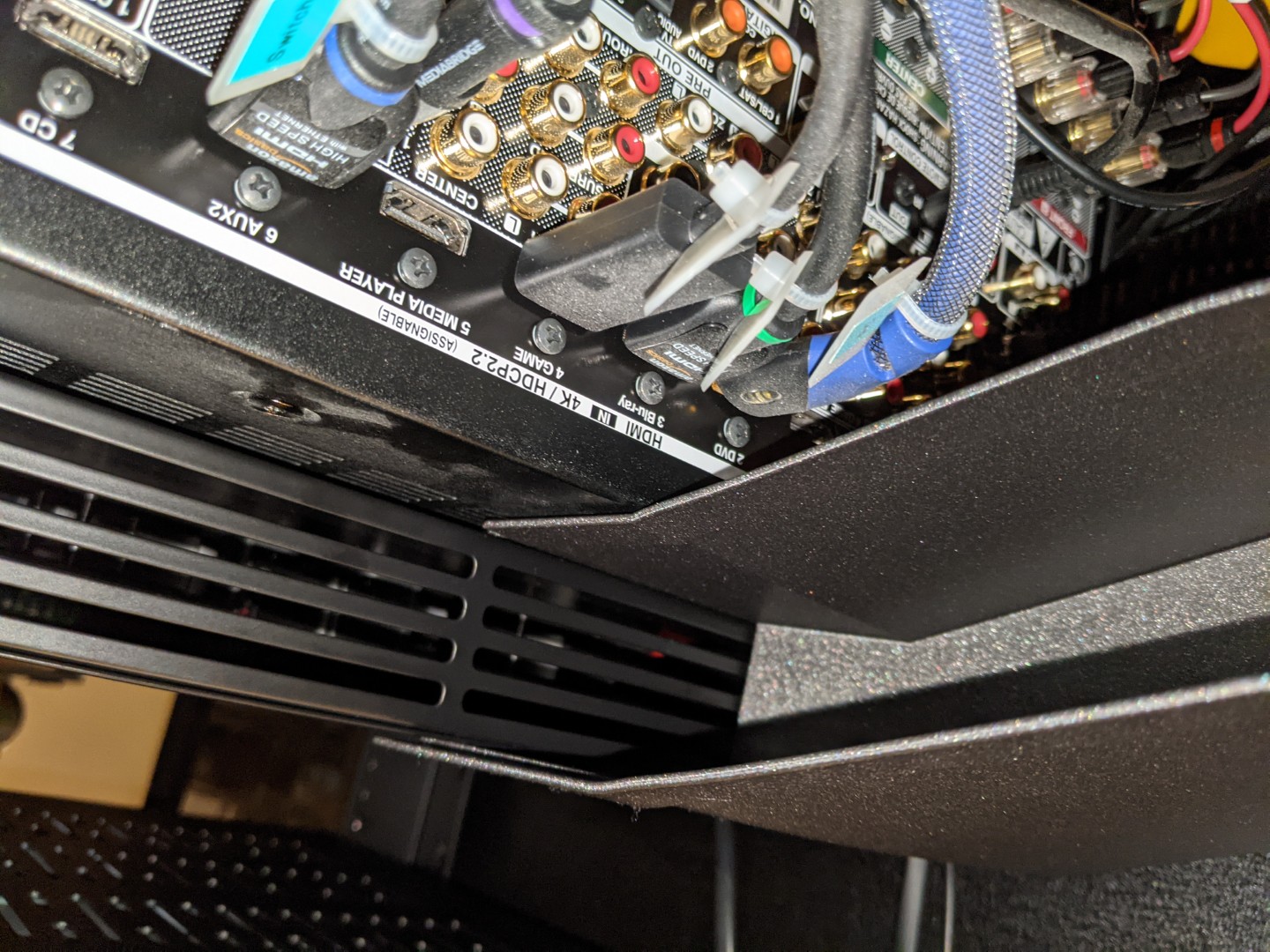 Ống dẫn gió (fan shroud) này được tạo ra để dẫn luồng khí nóng thoát ra từ ampli đi xuống và thoát ra ngoài qua khe thoát gió thấp ở tủ media rack. Cách này tốt hơn so với để hơi nóng dồn lại ở phía trên của rack, nơi máy PC được lắp.