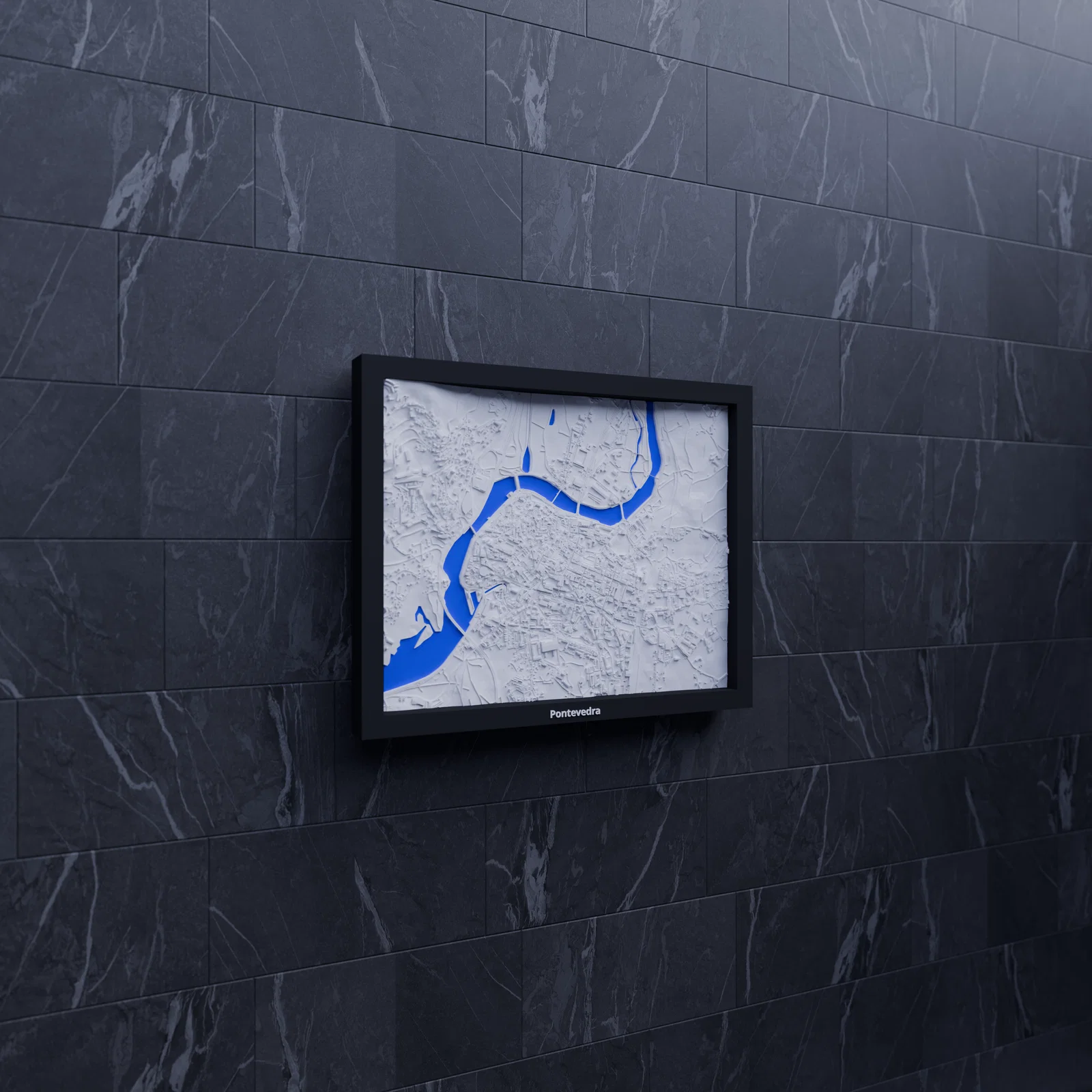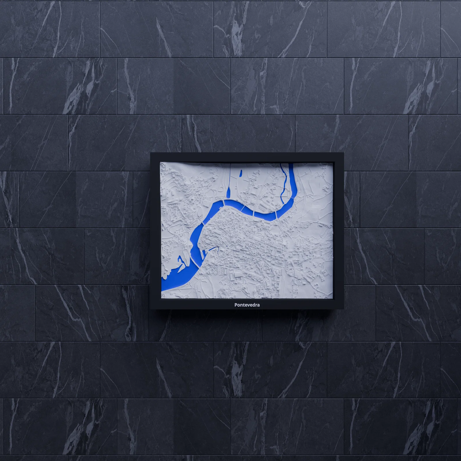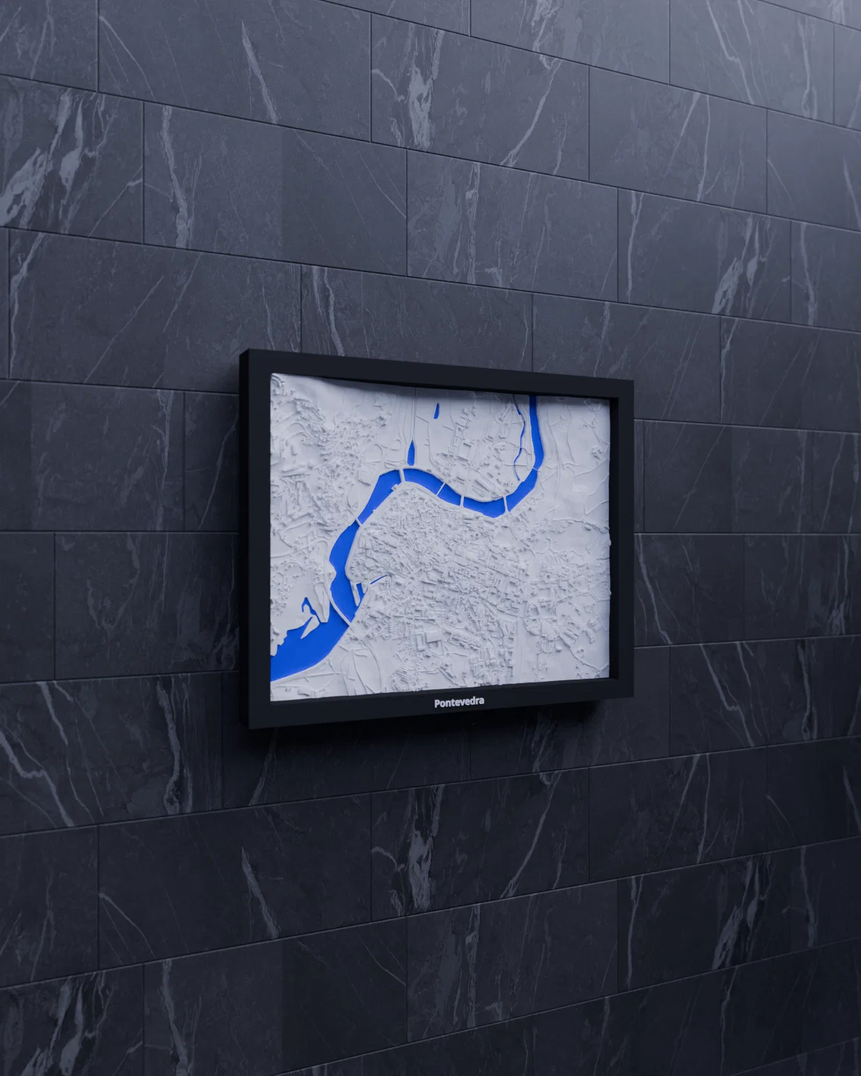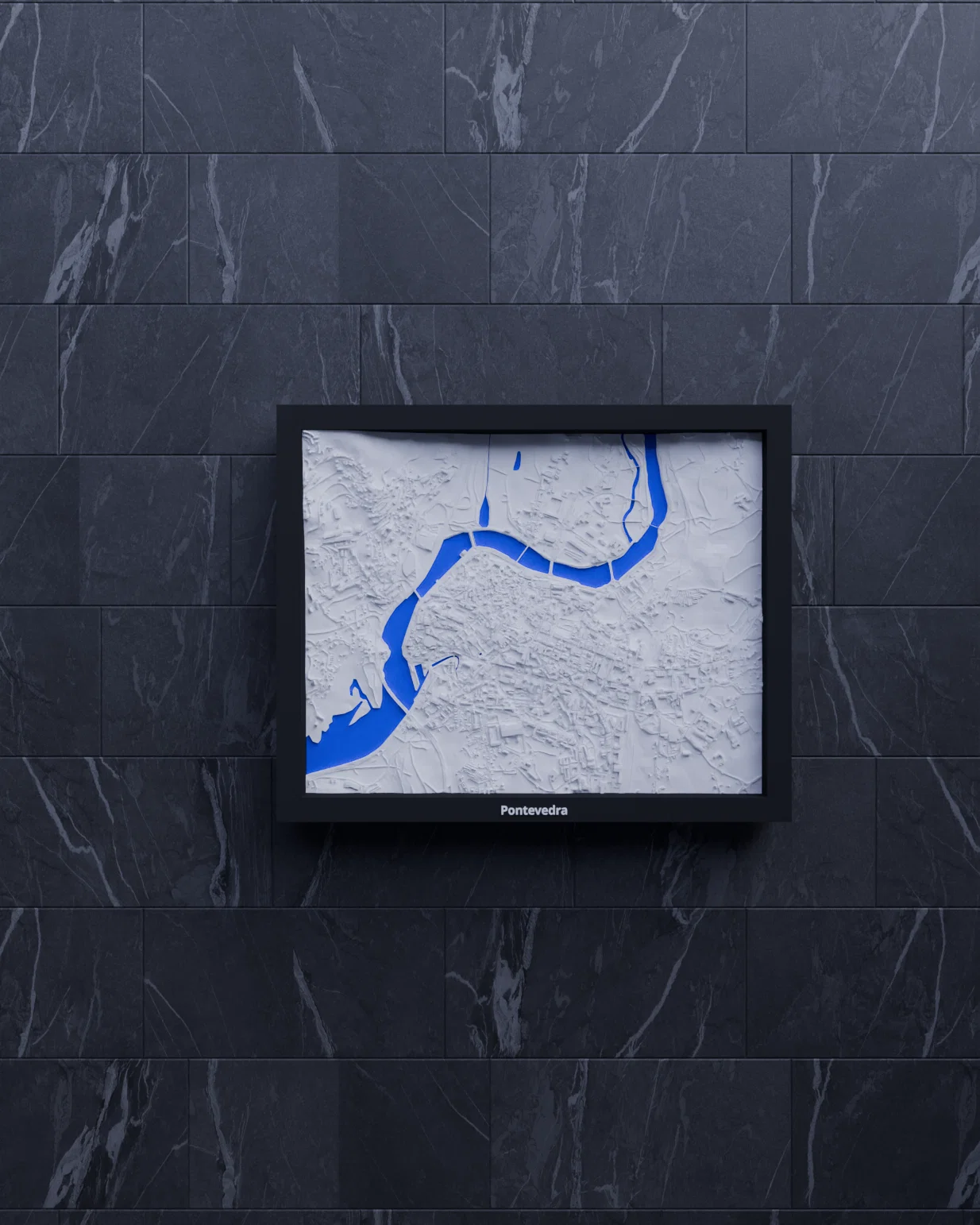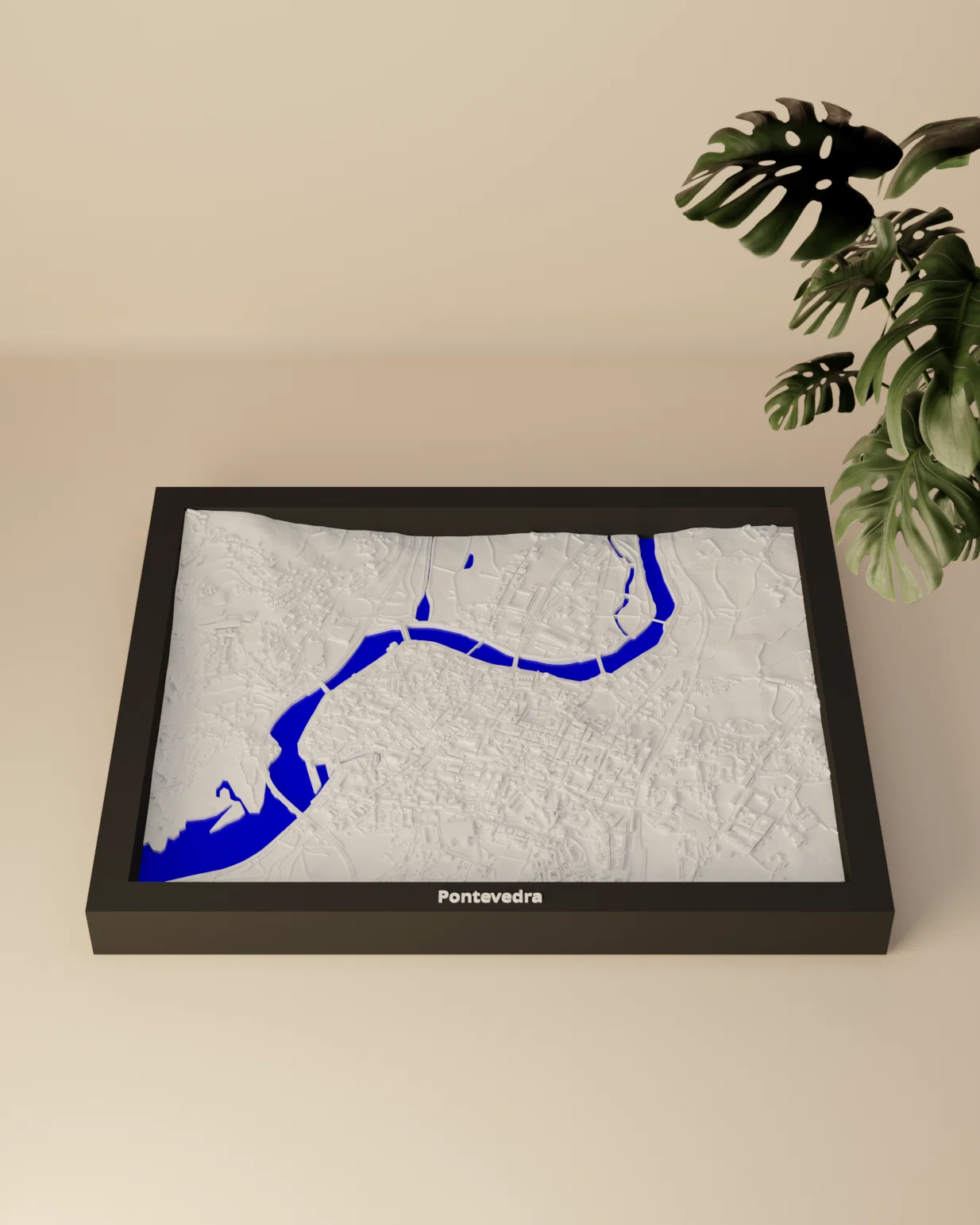 Mô hình địa hình (topographic) 3D thu nhỏ tái hiện Pontevedra, Tây Ban Nha từ dữ liệu địa lý. Kích thước in 190 x 150 mm, có nhiều lựa chọn frame kèm lỗ treo—hợp để học tập, trưng bày, làm quà.