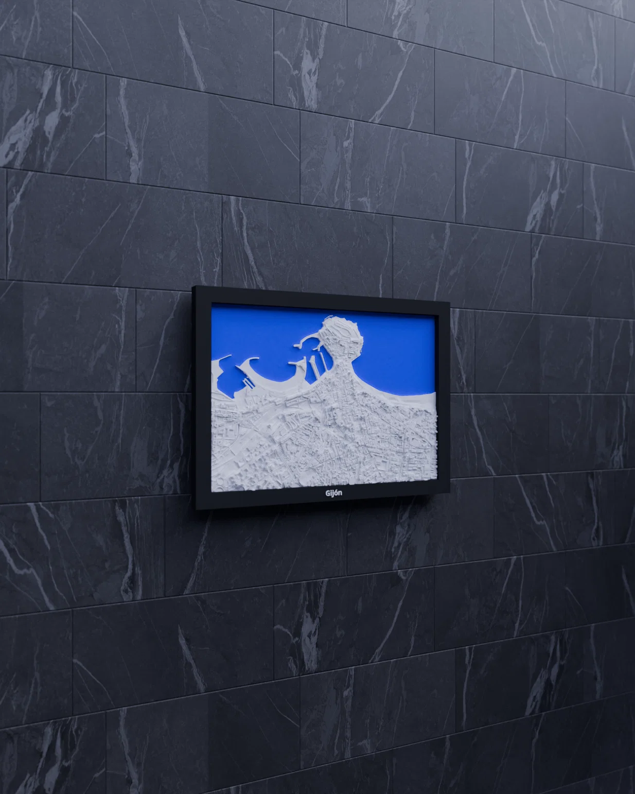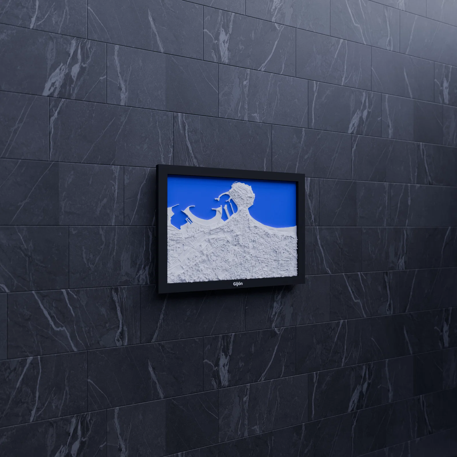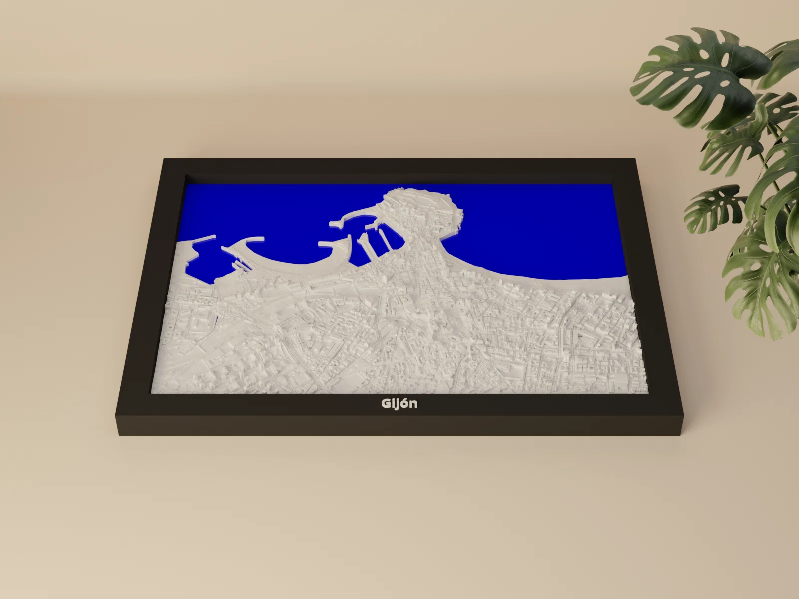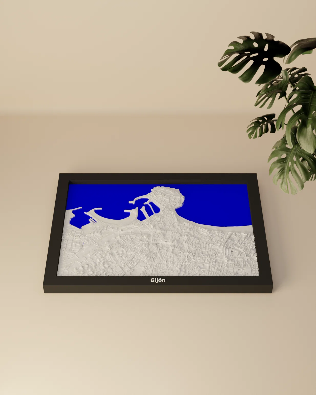 Mô hình thu nhỏ địa hình 3D của Gijón (Tây Ban Nha), dựng từ dữ liệu địa lý để tái hiện terrain chân thực. Kích thước in 170.5 x 119.5 mm, có các frame kèm lỗ treo, kèm print profile classic/arachne.