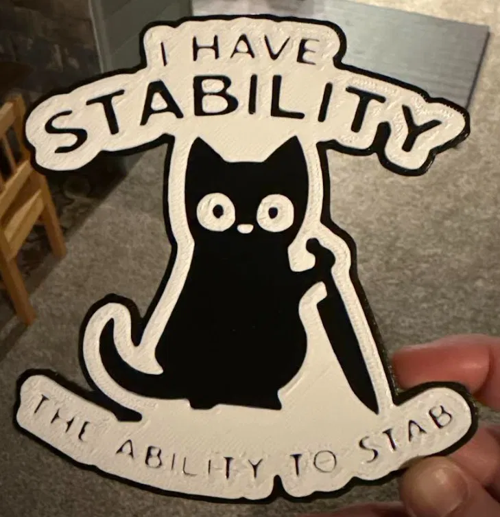 Bản remix của “I Have Stability – The Ability to Stab”, chỉnh lại từ mẫu gốc bị nhiều lỗi và chất lượng chưa ổn. Khi in, tác giả dùng nozzle 0.6 mm nên chữ đáy khó đọc hơn và phóng to khoảng 50%.