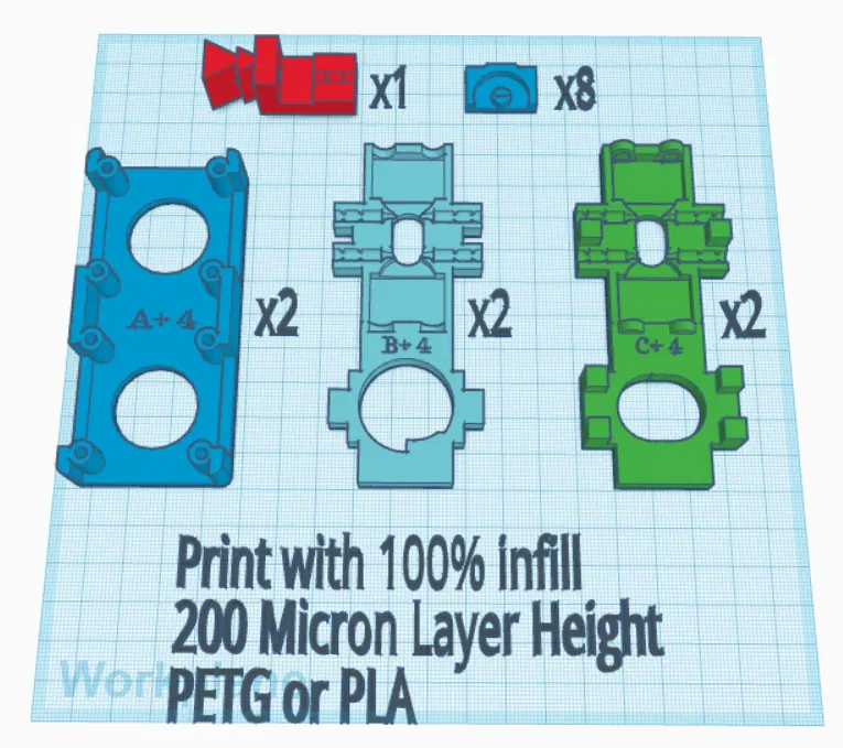 Trong bộ này có 5 mẫu: các chi tiết A+, B+ và C+ (mỗi loại bạn sẽ cần in 2 cái), một khuôn/cữ cắt ống PTFE để bạn dùng dao lam tạo các rãnh trên ống PTFE, cùng với các bearing carriers (bạn sẽ cần 8 cái). In ở chiều cao lớp .2mm, 100% infill, dùng PLA hoặc PETG.