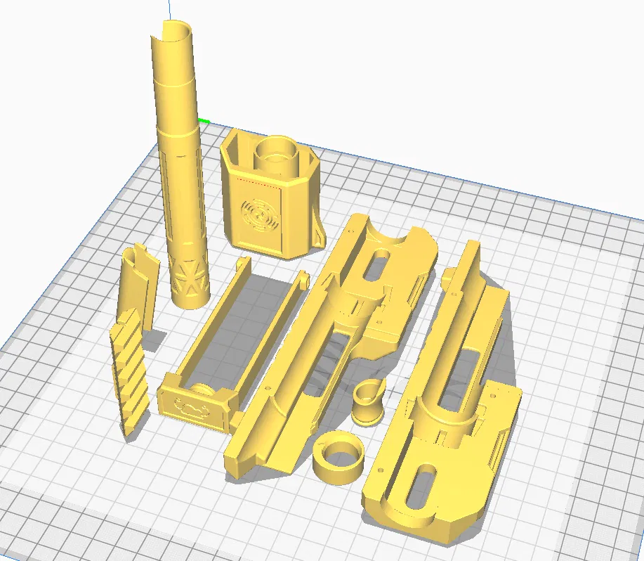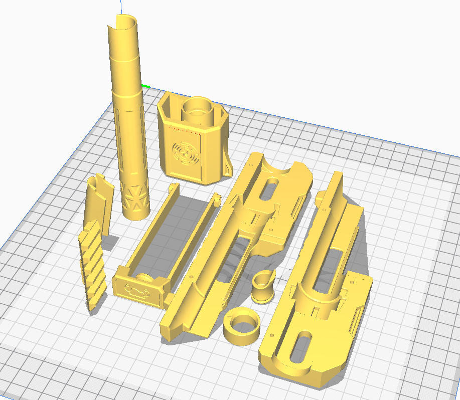 Cần support cho phần BreechSled, các phần còn lại thì không cần. Khuyến nghị dùng brim, nhất là với các phần BarrelConvert, Breech, UnderRail, và GripCover. Ngoài ra set bình thường là ổn. Mình khuyên tăng số walls và infill cho các phần Body. In các chi tiết theo đúng hướng như trong ảnh phía trên.