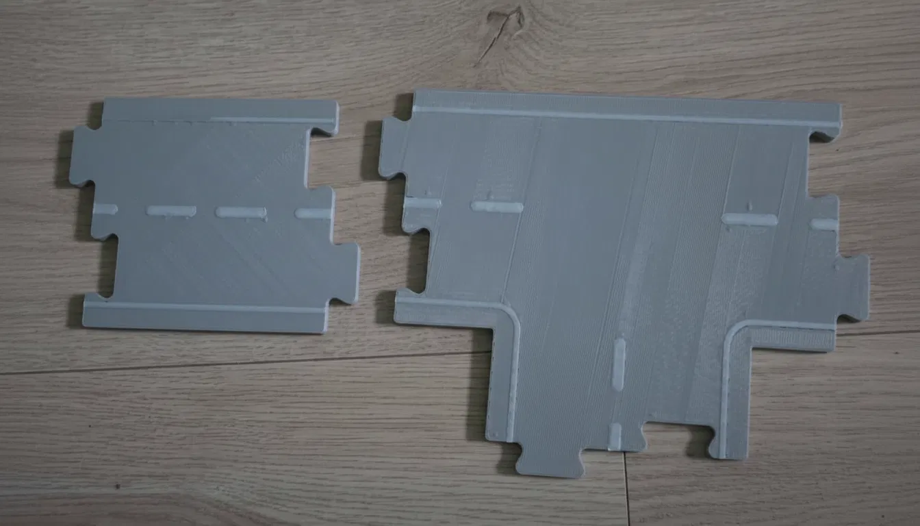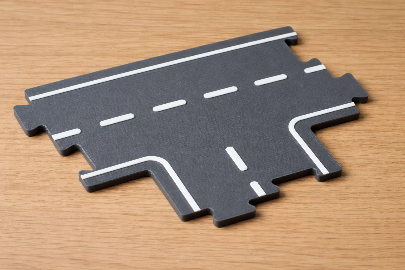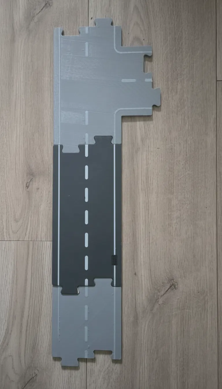 Bộ gồm 2 chi tiết đường tương thích Lidl Playtive: ngã ba chữ T và đoạn thẳng ngắn để canh chỉnh layout. Thiết kế 2 màu, vạch nổi, tối ưu đổi filament ở layer cuối. In PLA, 0.2 mm, không cần support.