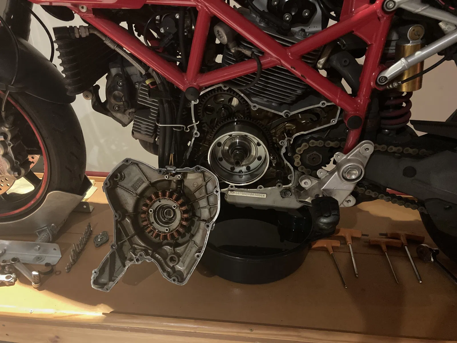 Đã xác nhận chạy tốt trên máy Ducati 1100 evo giải nhiệt gió (air-cooled) — động cơ 2 valve, 90° “L” twin. Khả năng cao cũng hợp với nhiều đời khác. Khoảng cách tâm giữa các bulông lốc ngoài (outer crank case bolts) là 56.5mm