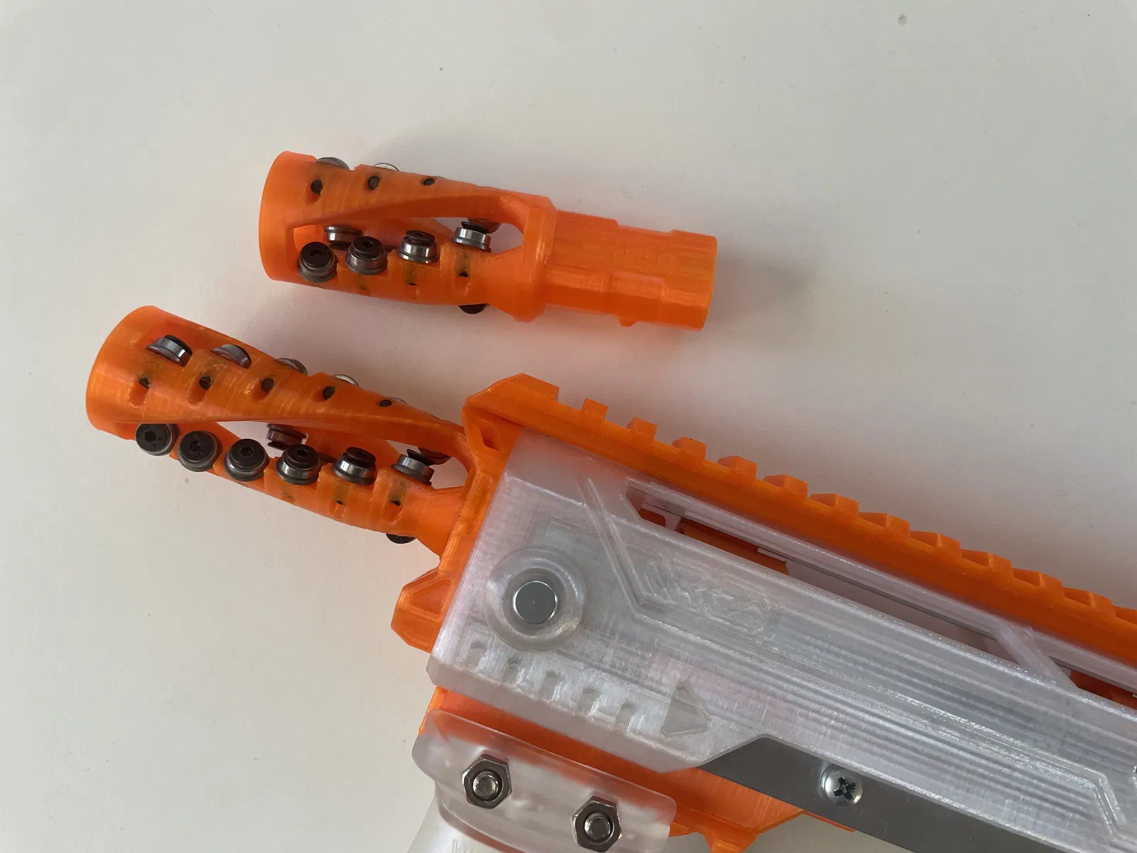 Cũng có thể trượt lên bất kỳ blaster dùng nòng 16mm, nhưng sẽ mất phần shroud như bản gốc.