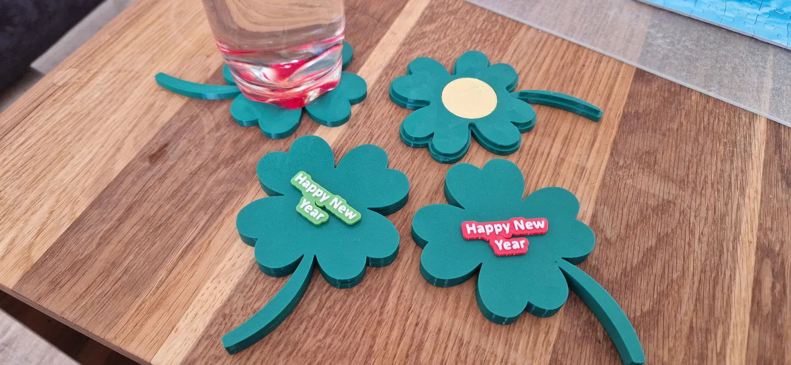 Mẫu quà tặng cỏ bốn lá cầu may cho dịp năm mới, thiết kế để bỏ vừa kẹo xu Manner Glücksmünzen bên trong. Nắp ôm khít, có 2 phiên bản; một bản có thể tháo ra dùng làm coaster.