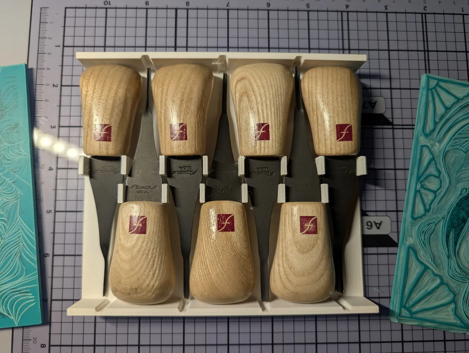 Mẫu giá đỡ (holder) dành cho Flexcut micro gauge, chứa được 7 mũi (gauges) giúp sắp xếp gọn gàng và dễ lấy khi làm linocut/khắc. Phù hợp để in 3D và dùng trên bàn làm việc.