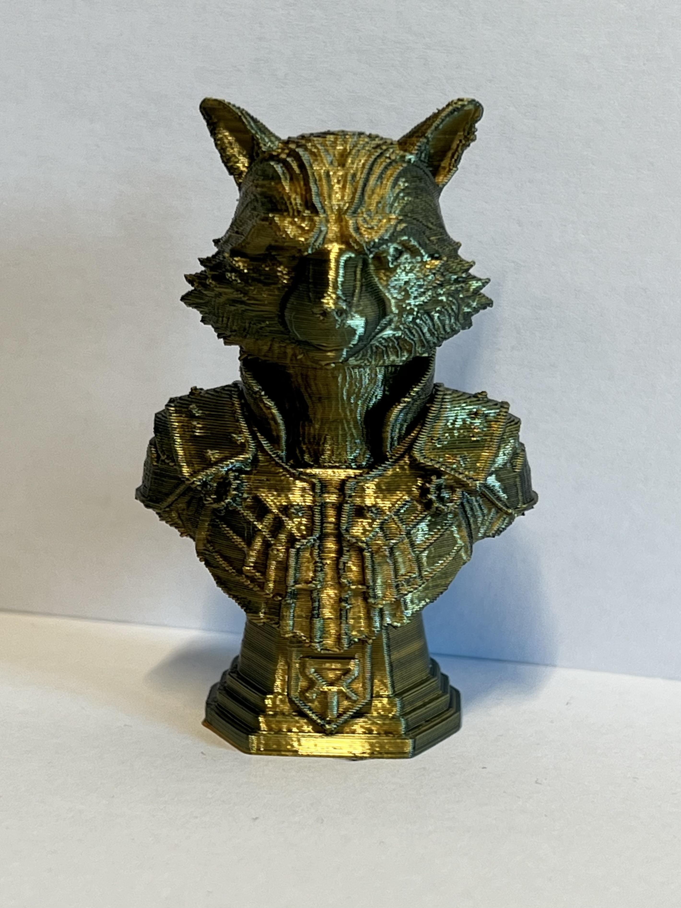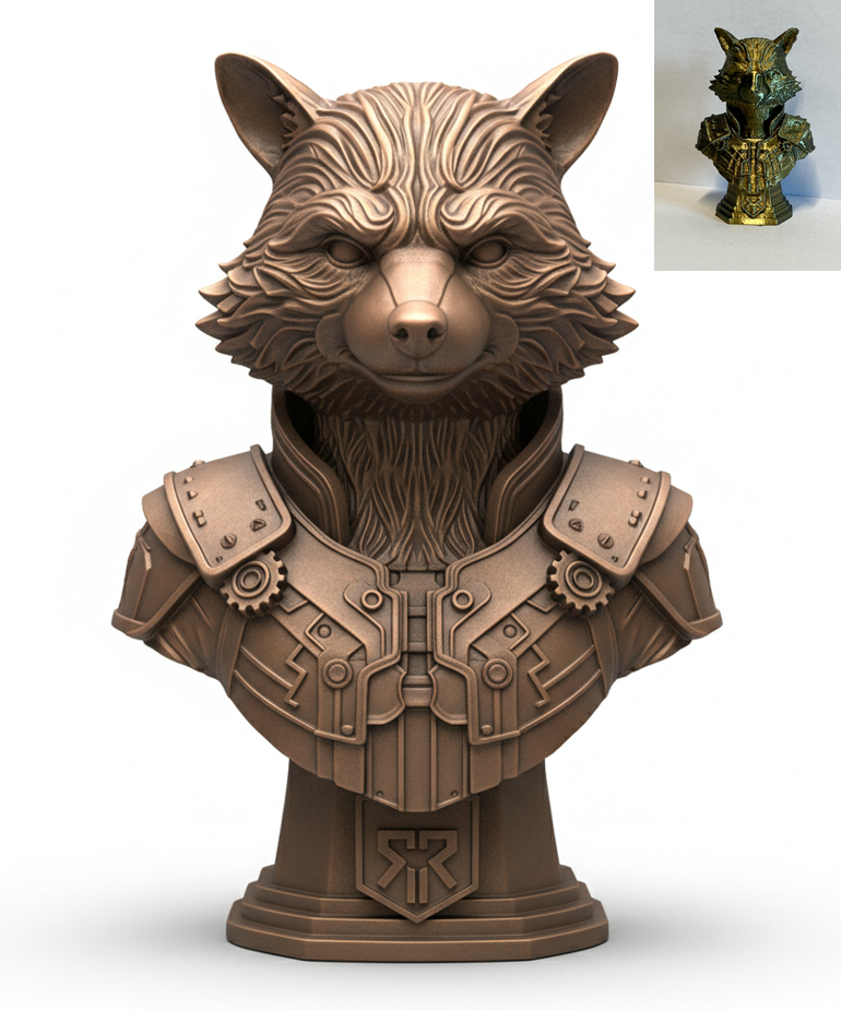 Mẫu tượng bán thân Rocket Racoon Bust do AI tạo, phù hợp in 3D để trưng bày. Tác giả in kích thước nhỏ trên máy in hơi cũ và tối ưu tỷ lệ chất lượng/thời gian; ảnh chỉ mang tính minh hoạ nhưng mẫu in được bình thường.