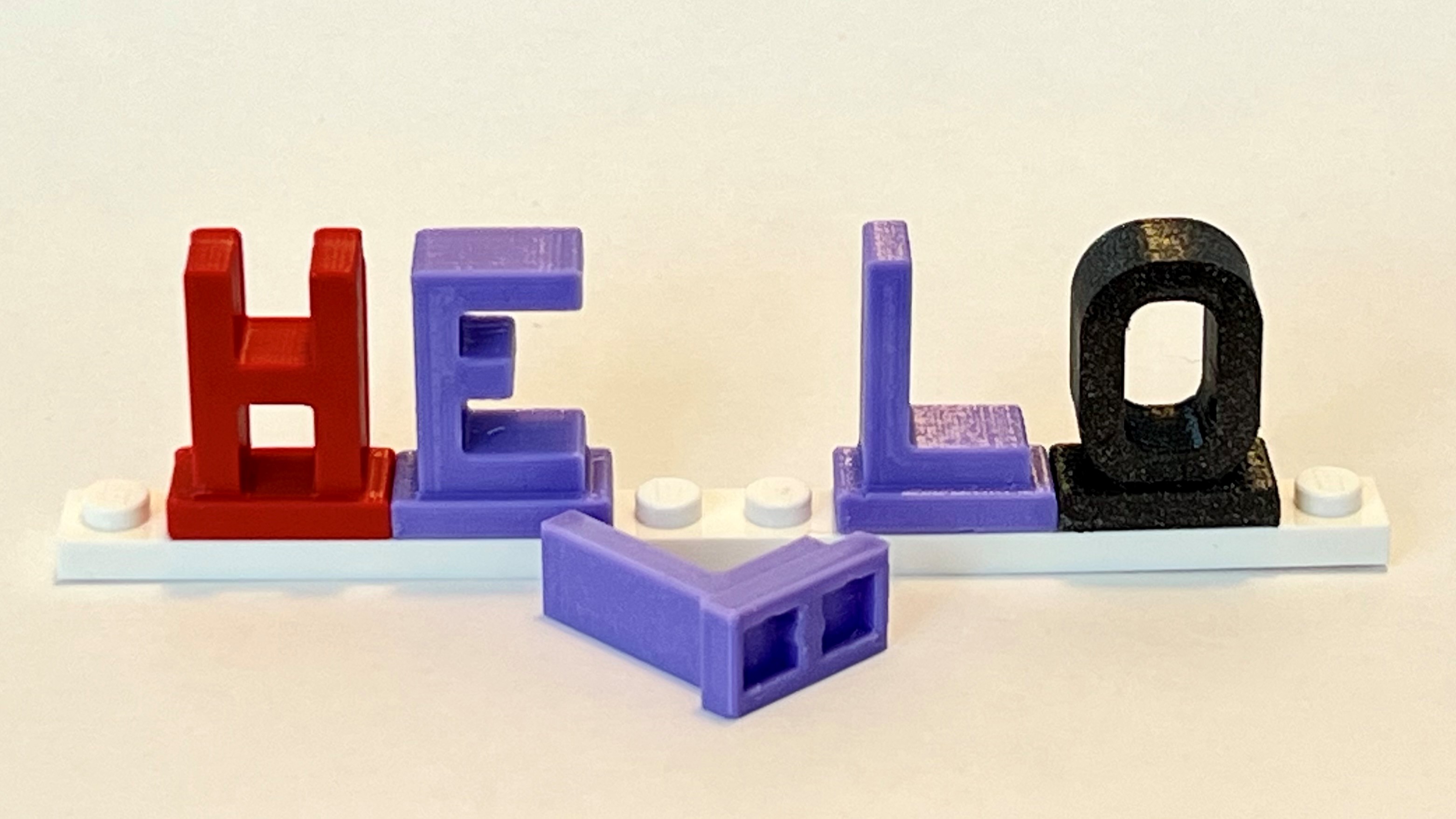 Những chữ cái và số tương thích LEGO này được in nằm phẳng trên mặt bàn in, rồi có thể bấm (snap) vào các viên gạch Lego đang dựng đứng.