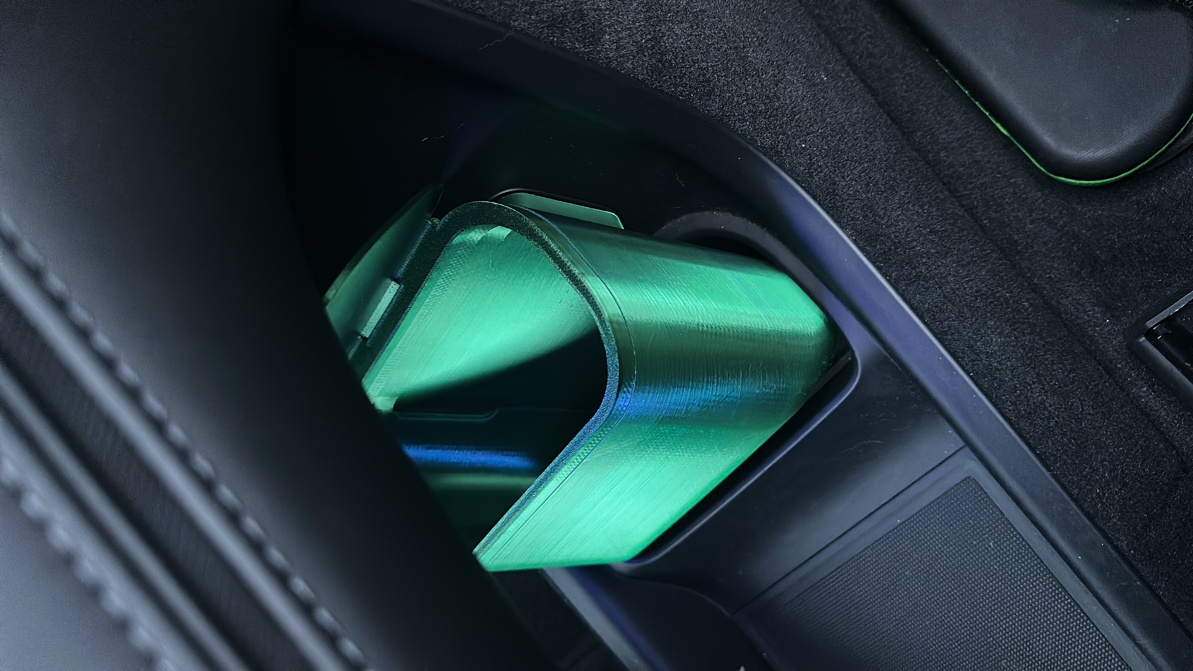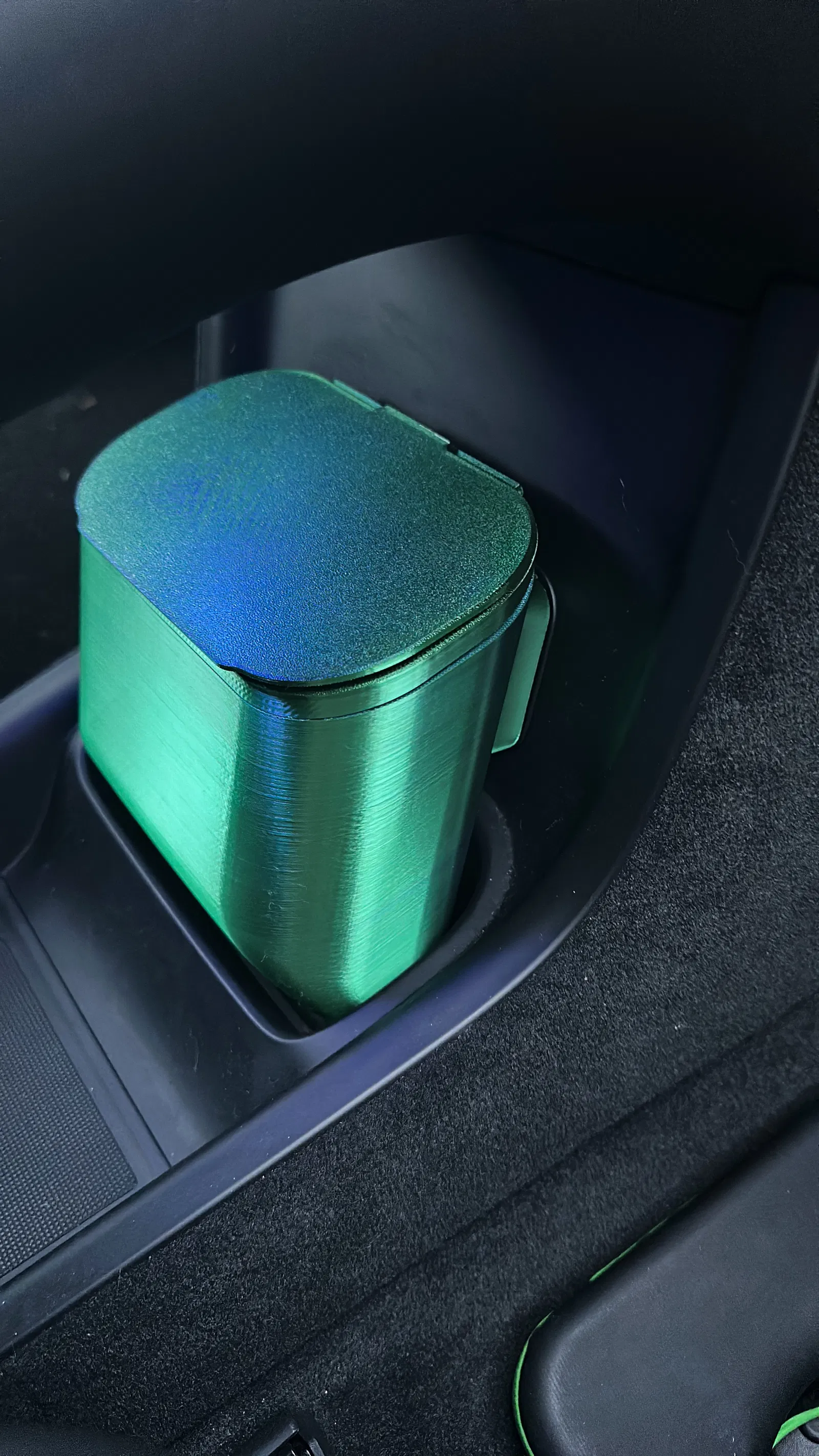 Mẫu thùng rác Polestar 4 thiết kế để vừa khít center console. In 3 phần (thân, đáy nắp, nắp trên), có 4 lỗ 9mm để gắn nam châm. In PLA, infill 10%; chỉ phần thân cần supports.