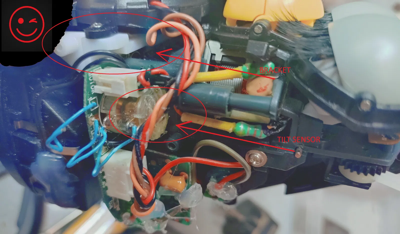 Bộ phận thứ hai, giá đỡ, được lắp vào giữa hai nửa thân chính của Furby và giữ cụm cảm biến nghiêng đúng vị trí để hoạt động ổn định.