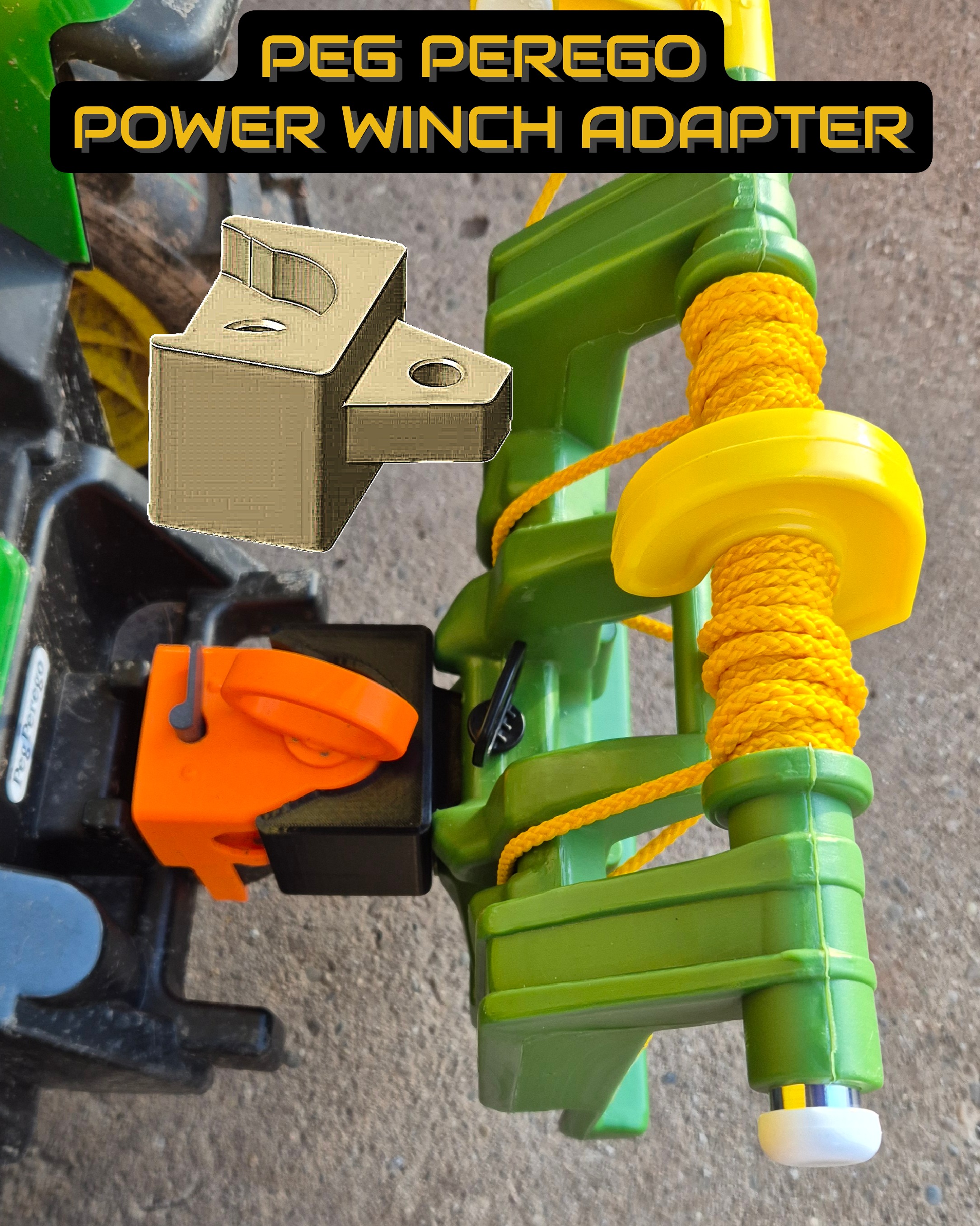 Adapter cho Peg Perego Ground Force để gắn và dùng được tời (winch/Seilwinde) zin với bộ móc kéo (trailer hitch). Mẫu được in PETG trên Prusa MK4S và có dùng support.