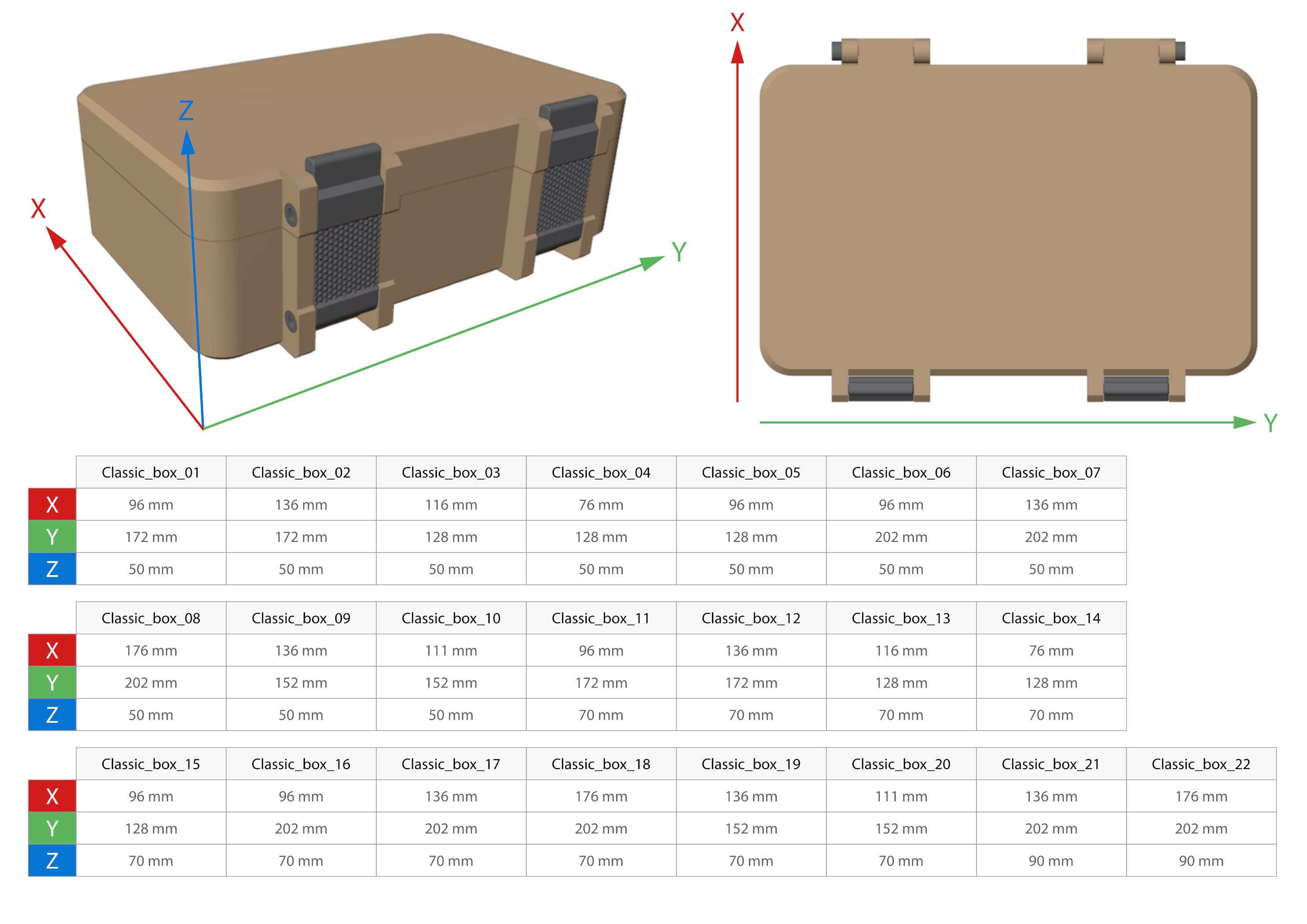 Image 1: Tổng quan kích thước của tất cả biến thể hộp hiện có.