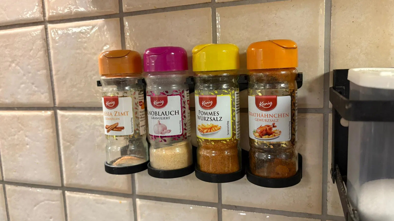 Kệ/holder in 3D vừa khít cho hũ gia vị Kania (Lidl). Thiết kế tự làm vì khó tìm mẫu phù hợp. Gợi ý print: PLA, layer 0.2 mm, 4 perimeters, infill 25% Gyroid.