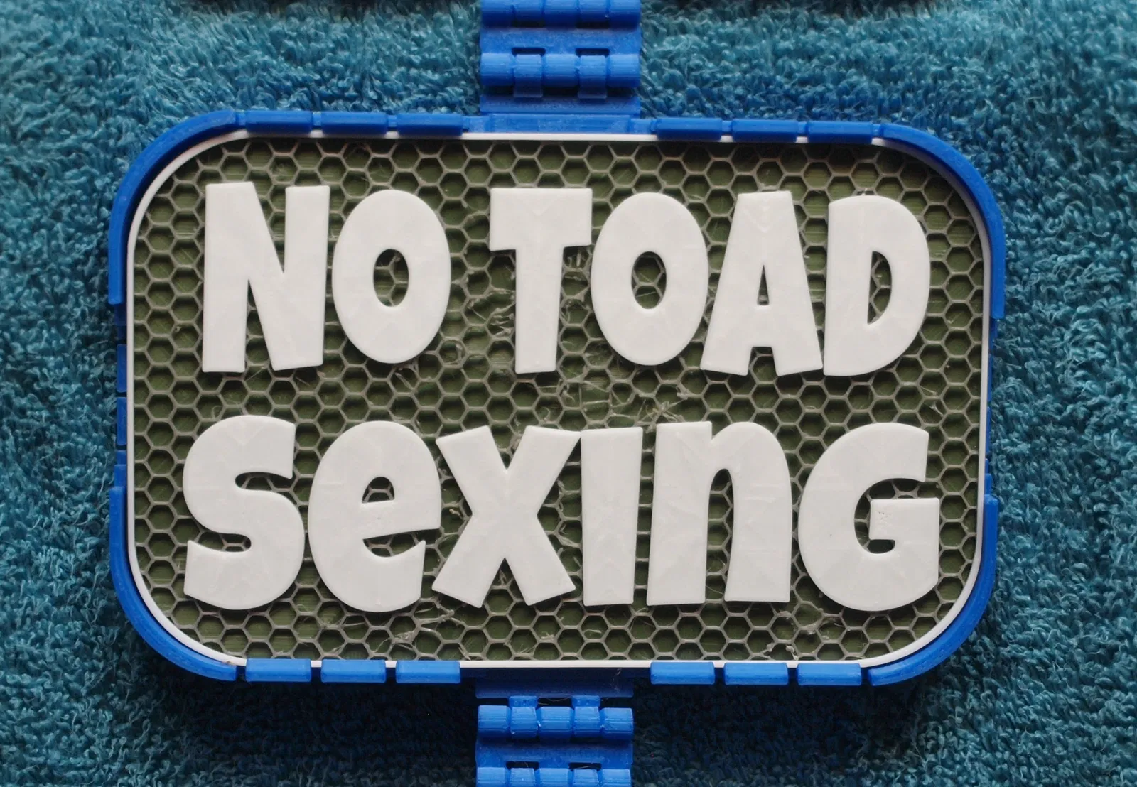 Bảng hiệu 100x160mm ghi “No Toad Sexing”. Có sẵn file Mesh và Solid để dễ in hơn; khuyến nghị đổi màu ở trên mốc 1mm như gcode kèm theo. Ảnh chụp trong Shadowbox Frames, vừa với các bảng hiệu khác.