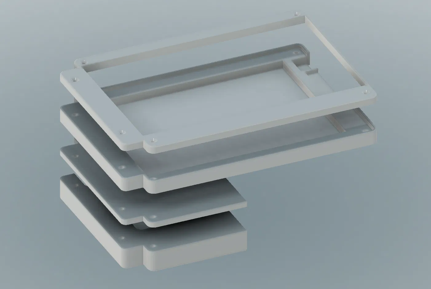 Thiết kế gồm 4 part: Top và Base để giữ màn hình, và một part để giữ powerbank. Cái part nằm giữa Base và ngàm giữ powerbank thì không bắt buộc (cuối cùng mình cũng không in nó).
