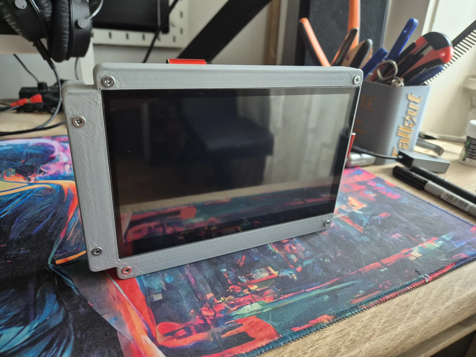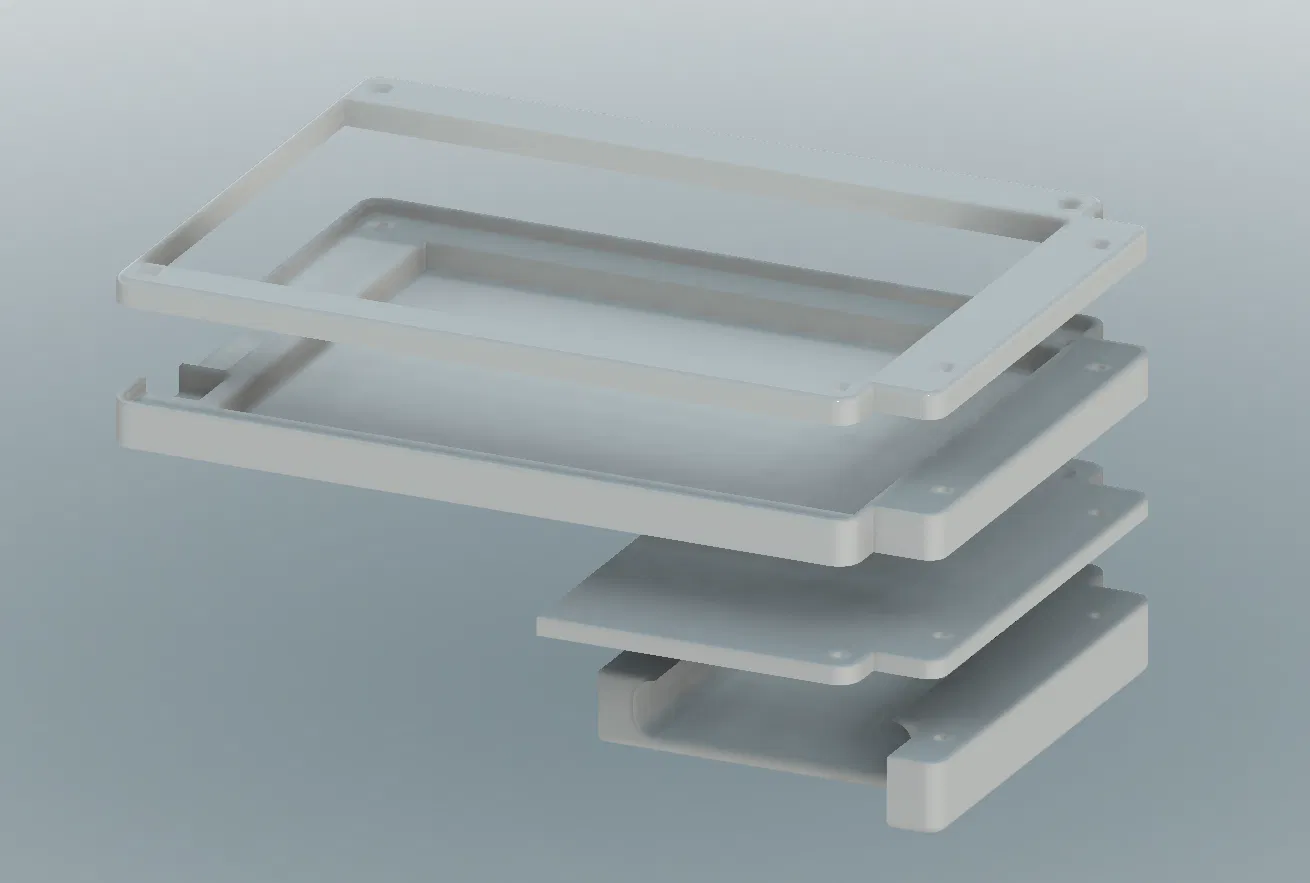 Case mini cho màn hình HDMI di động 7 inch (multitouch 1024x600) kèm ngàm giữ powerbank 5000mAh. Thiết kế 4 part, ốc M3; in PLA 0.2mm, infill 25%, 3 wall; support chỉ cho phần ngàm powerbank.