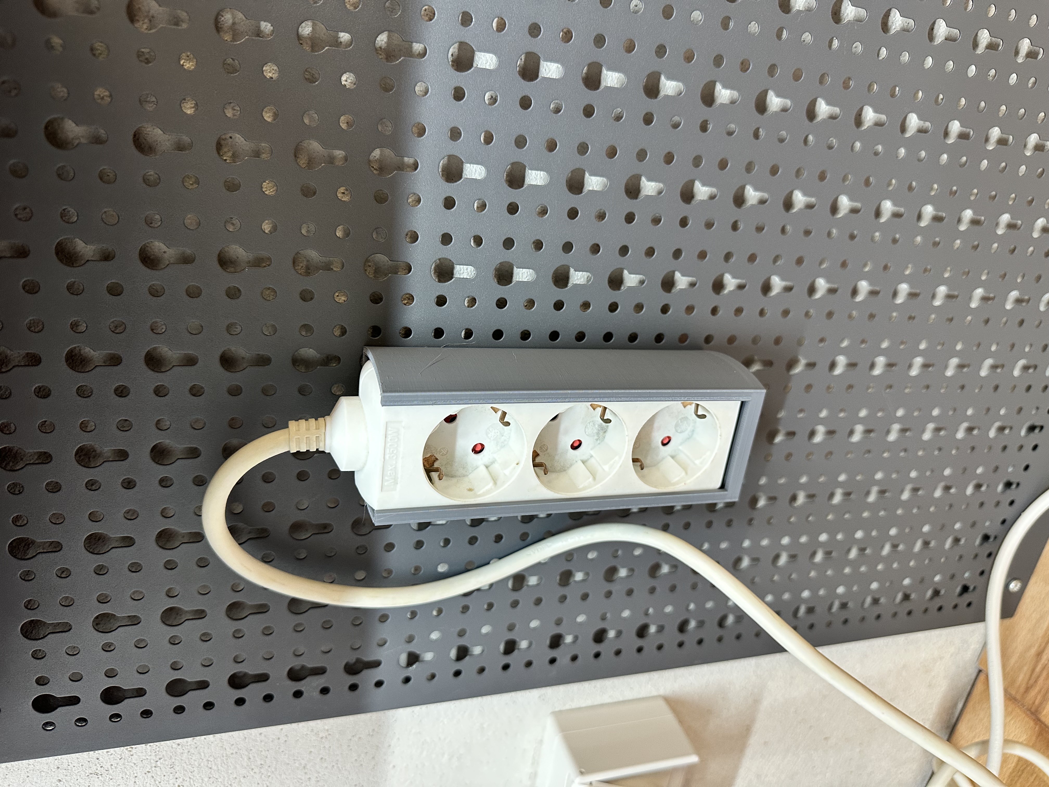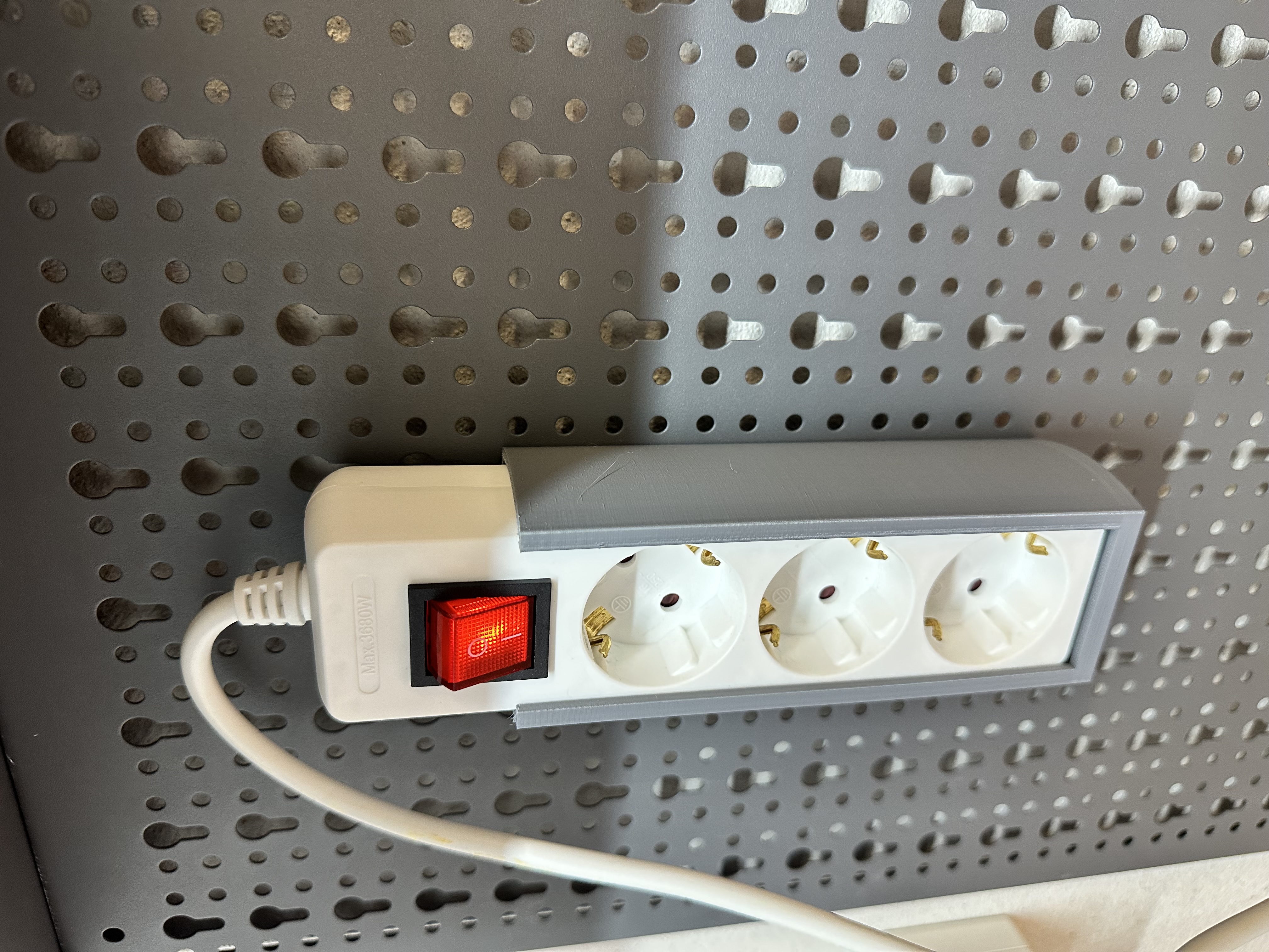Mẫu giá đỡ in 3D giúp cố định ổ cắm điện (power strip) lên tấm pegboard Küpper (Lochwand/Lochblech). Móc/cài chắc chắn, giữ ổ cắm ổn định, dễ bật tắt và quản lý dây gọn gàng tại góc làm việc.