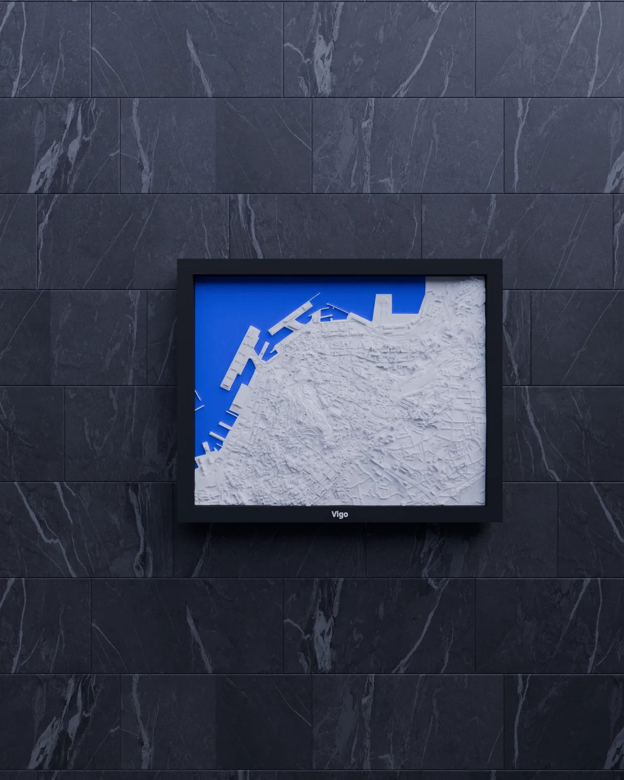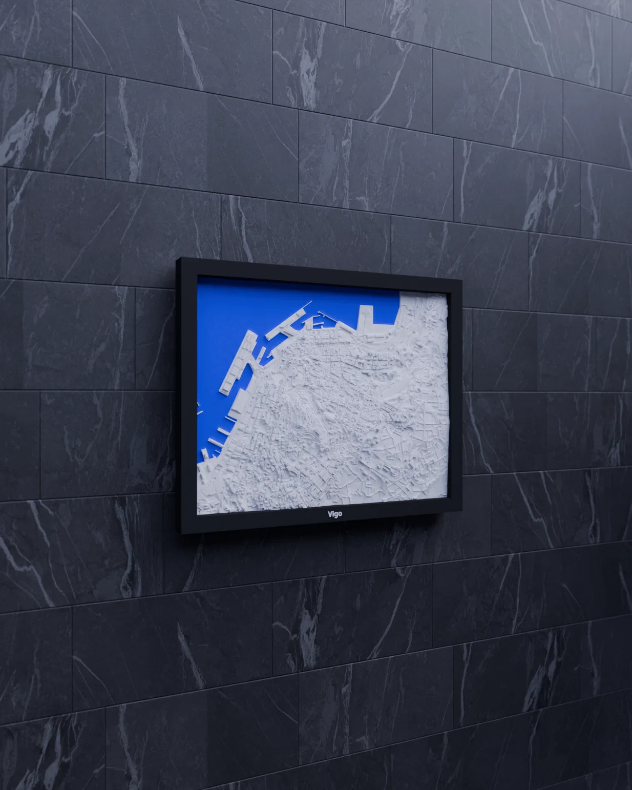 Bản thu nhỏ địa hình Vigo (Tây Ban Nha) in 3D, dựng từ dữ liệu địa lý để tái hiện terrain chân thực. Kích thước in 190.0 x 150.0 mm, kèm nhiều lựa chọn khung có lỗ treo, phù hợp decor hoặc học tập.