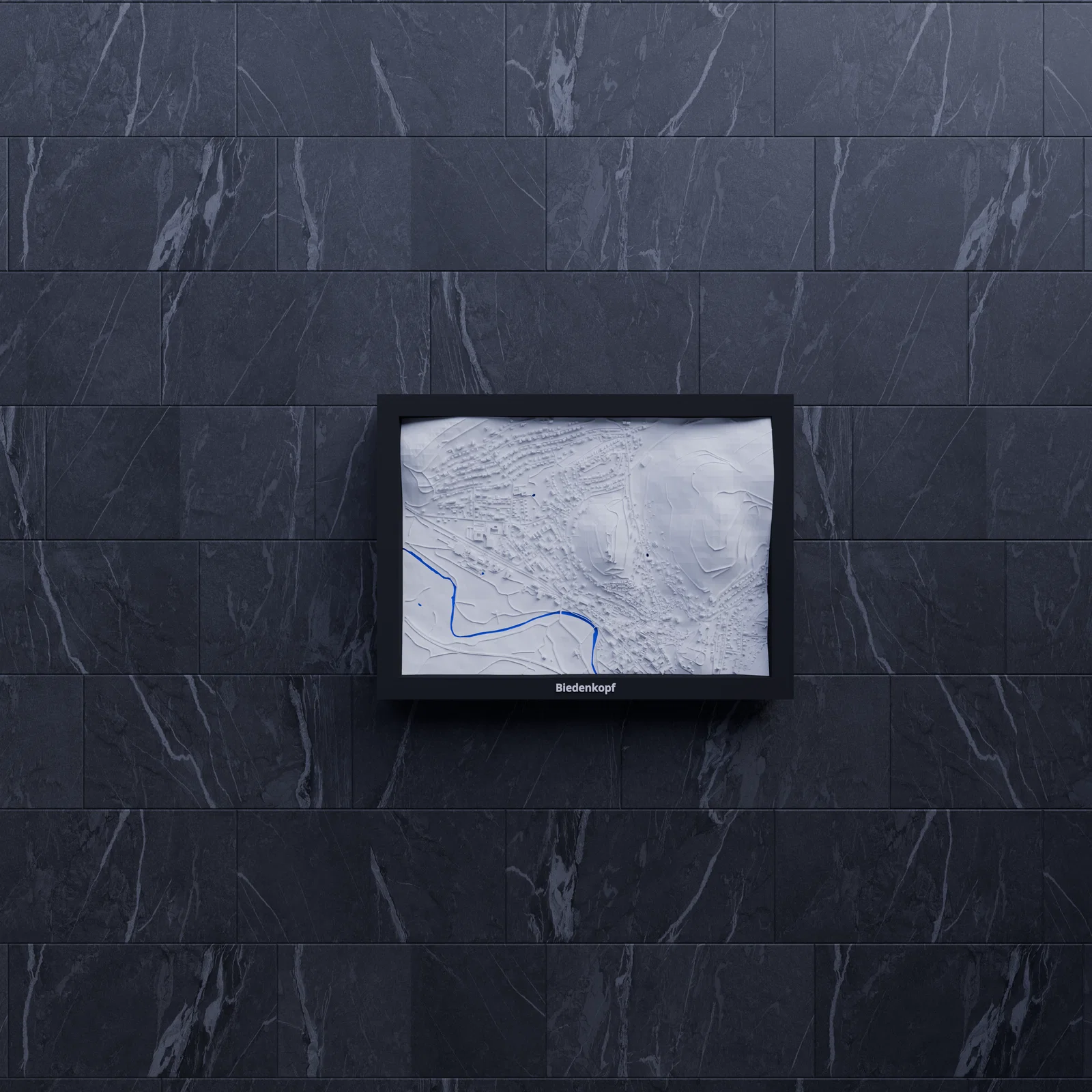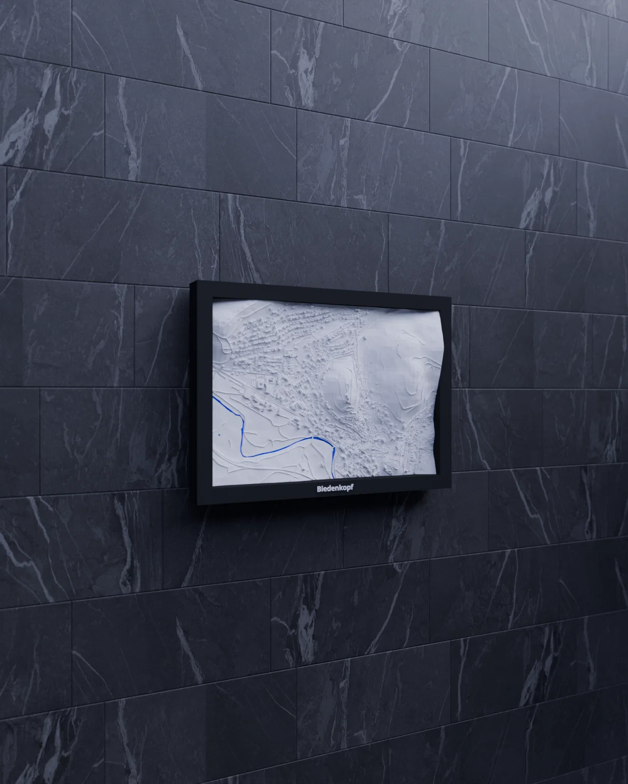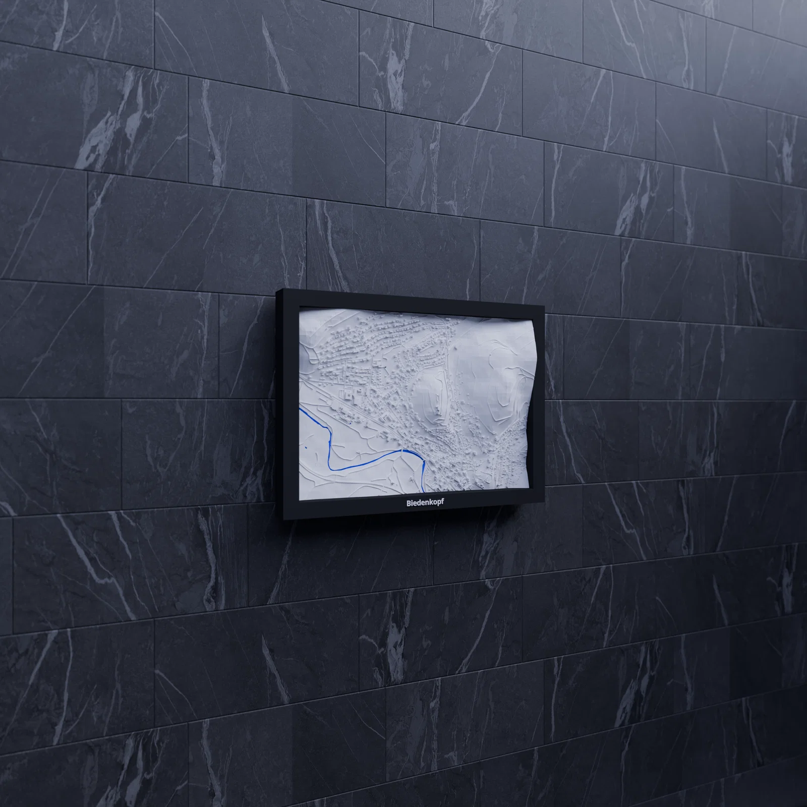 Mô hình thu nhỏ địa hình (topographic) của Biedenkopf, Đức, dựng từ dữ liệu địa lý để in 3D chân thật. Kích thước 170.5 x 119.5 mm, có các frame kèm lỗ treo, phù hợp trưng bày, học tập và quà tặng.